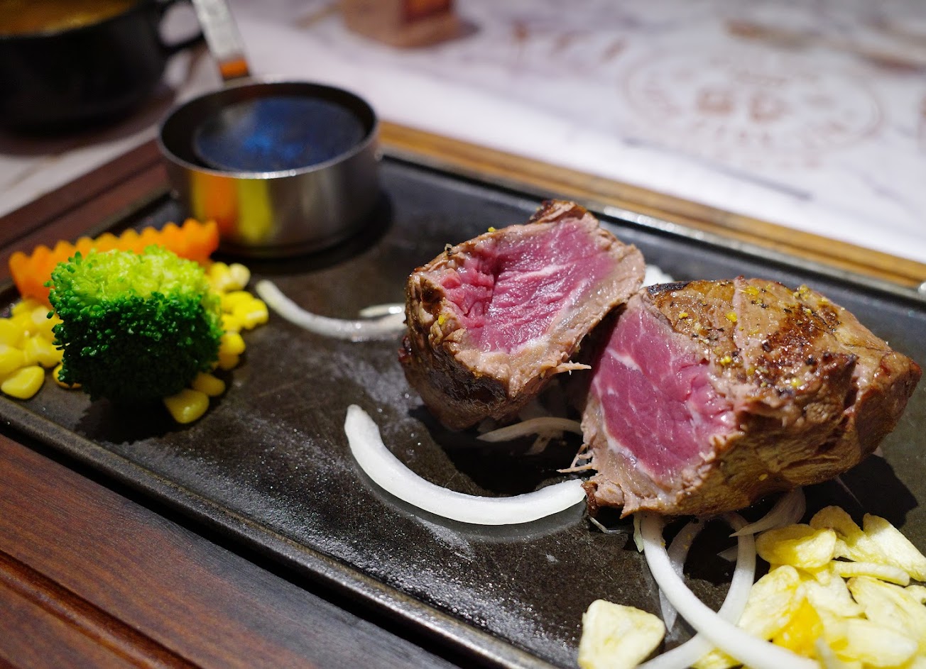 🥩 牛排附有小鐵板,可供客人再加熱或增熟牛排,即使吃比較慢,也能靠小鐵板再次加熱,小鐵板涼了可請服務人員更換。 🥩 厚切菲利超讚讚,沒有三色豆充份量也讚讚。