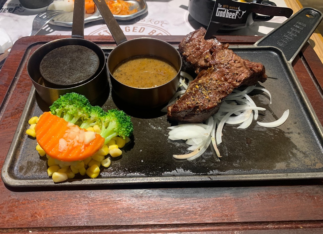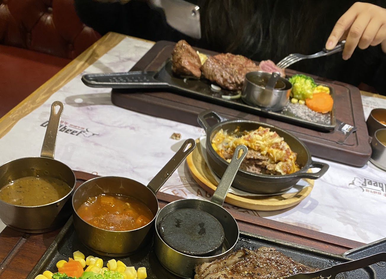 建議先預約~ 自助區有小菜(醃蘿蔔小黃瓜紅蘿蔔、韓式泡菜)、湯品(番茄羅宋湯、玉米濃湯)、飲料吧、冰淇淋可自行取用。 個人很喜歡小菜&番茄羅宋湯,湯裡的牛肉給的很有誠意,軟嫩好吃!推?? ?TGB特選丹佛:個人覺得相對有嚼勁,吃到後面嘴巴有點酸? ?安格斯沙朗心:肉質軟嫩剛好,較推?? ?蒜味奶酪脆薯:脆薯搭配沾醬很好吃!很推?? 餐點:4 服務:5 氣氛:5