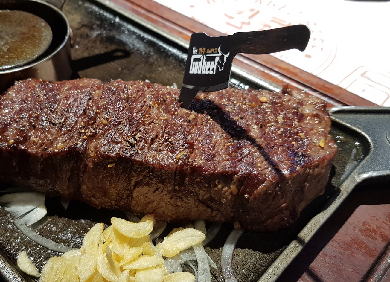 這家的牛排刀很特別,是一把斧頭??