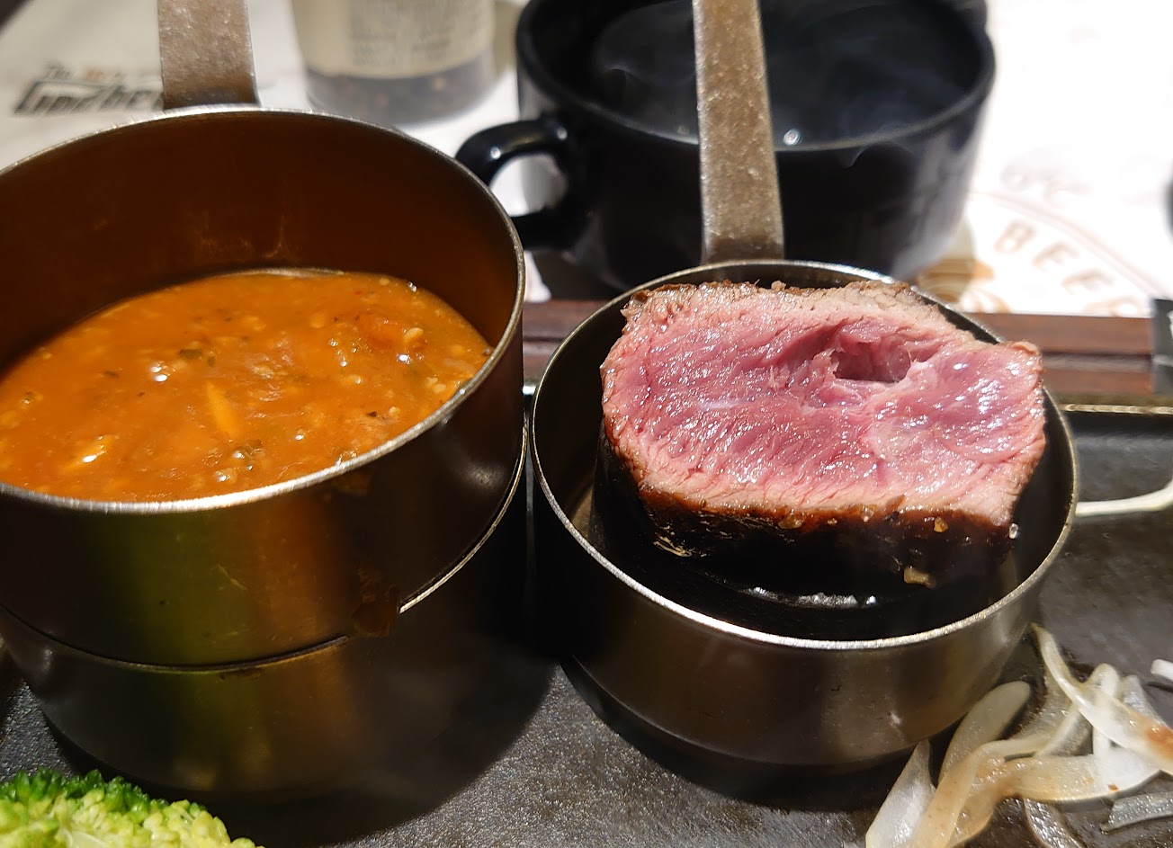 鐵板也有附上加熱石,可以調整生熟度。 個人跟先生都建議點3分即可,不夠可再加熱。因為光是板腱五分,肉質就已經略乾了,更別說友人點7分沙朗,整體已經算熟透、有點乾柴了……。