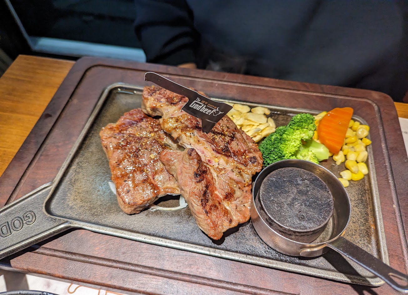 店內擁擠,自助吧那區動線不佳 拿湯的時候還要很小心注意看店員有沒有端著牛排經過 餐點並不如菜單上說的嫩度四顆星 嚼起來很韌 不知道是不是對於嫩度的定義不太一樣 牛排上的鹽灑得太多有夠鹹,建議可以不要灑,讓客人自己調味⋯ 一旁的配菜超沒存在感,一點味道也沒有,是純粹擺盤用(? CP值不高,不會再回訪