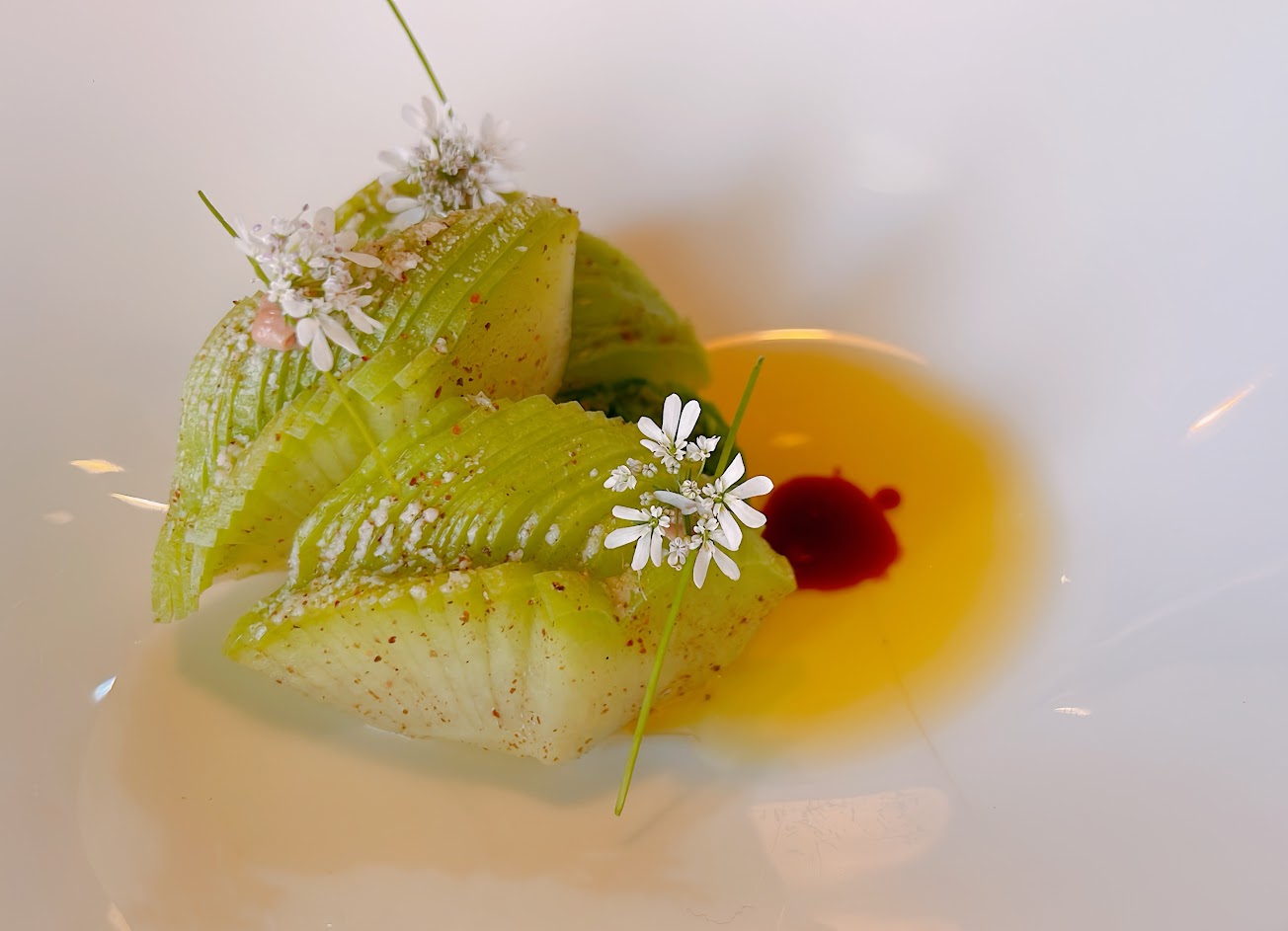 A5和牛油花很足5分熟的肉很軟嫩,放嘴裡像化掉一下子就不見了,配一點豆豉醬汁牛的味道更濃厚,韭菜香點綴著油脂讓口感更豐富。