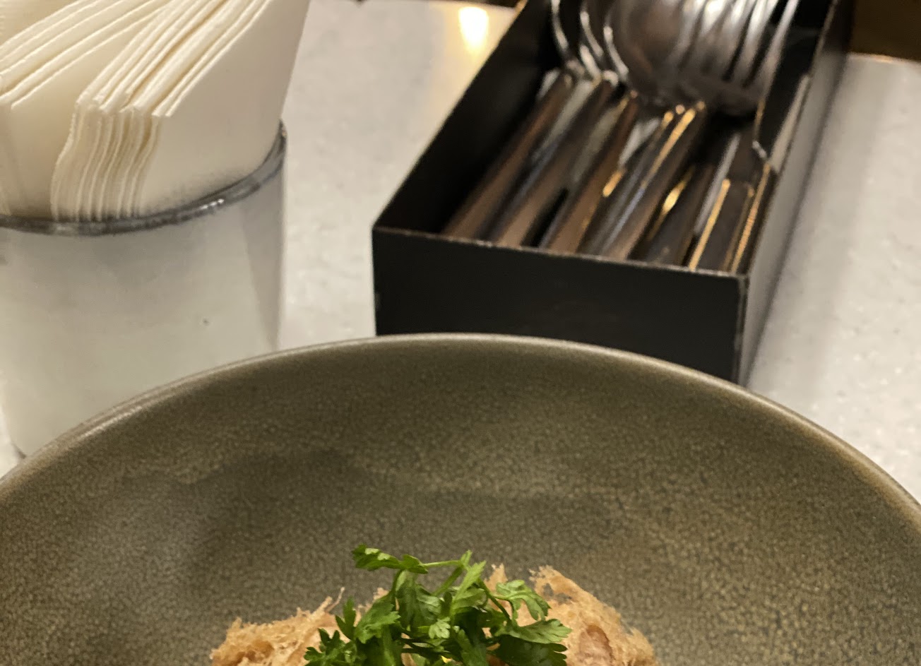 這次點了麻辣牛舌、口水雞沙拉、蟹肉塔可、海膽燉飯、酥炸軟殼蟹辣椒細扁麵,每道菜都很好吃!餐廳裝潢與氣氛也很舒適,特別喜歡口水雞沙拉跟酥炸軟殼蟹辣椒細扁麵~值得再訪的好店!