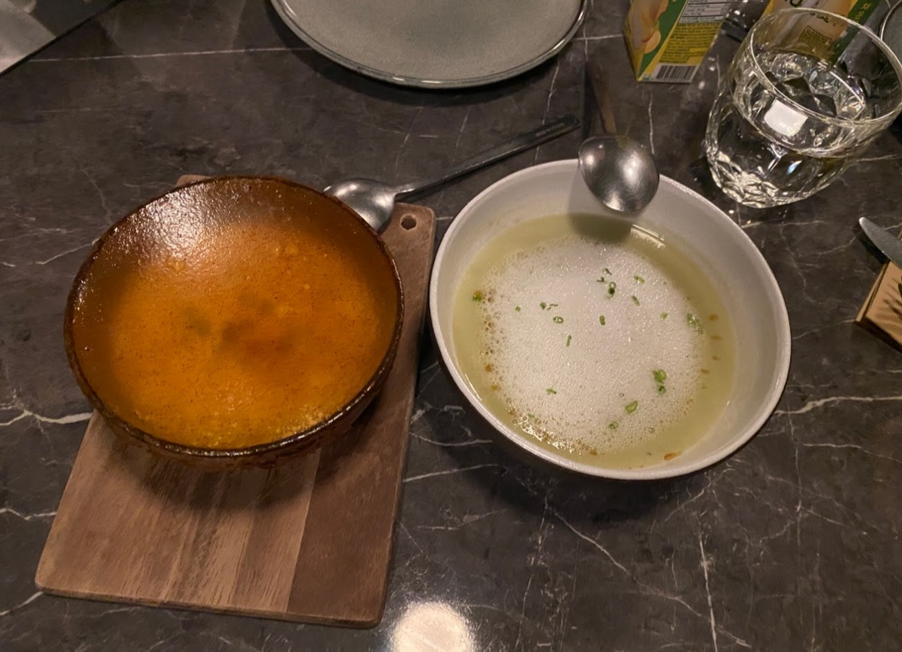 當晚吃了法式絲瓜蛤蜊湯、黃金蛋黃炸雞、無花果布拉答起司、還有海膽燉飯。湯跟起司還不錯,但是海膽跟炸雞還可以再細緻些