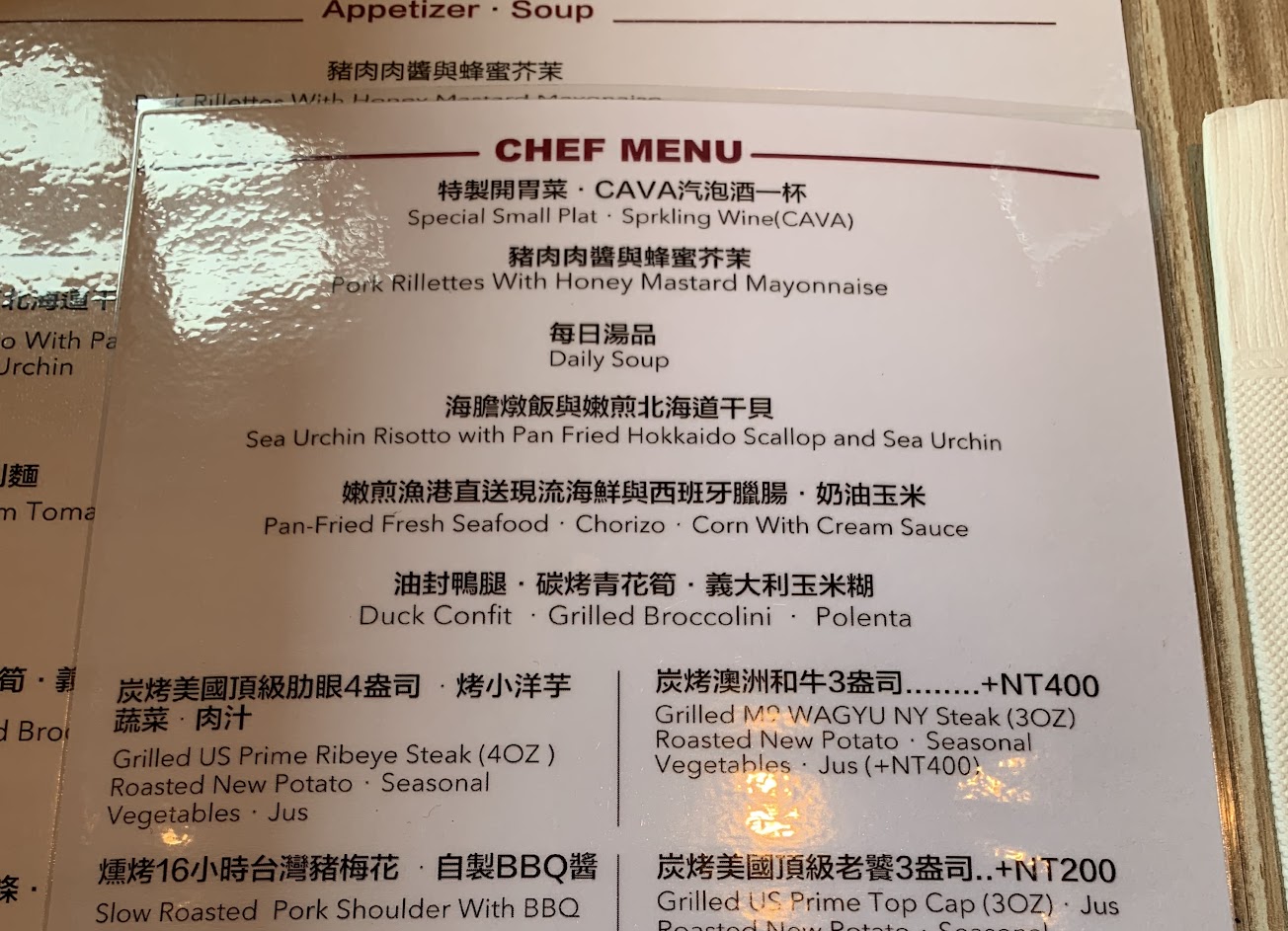 我們聖誕節預訂了1500/人的主廚私房菜,加一成後2人總共3300元,說是按照當日食材料理,我們可能期待也比較高;但到了現場發現所謂的私房料理當場用菜單點就有了,且全部用單點的還比較便宜;實際份量也沒有網路上部落客說的那麼cp值高,吃下來大概6分飽,完全踩雷感受。
