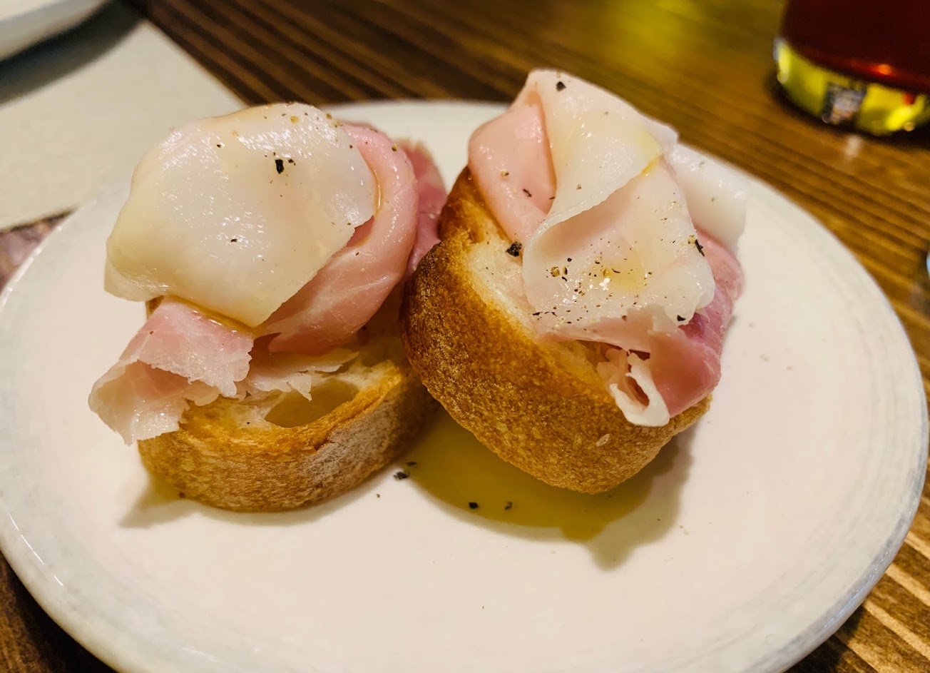 ✅開胃菜:自製黑豬肉熟火腿 原本是點,服務生看我們有四個人建議我們升級成大份就會有三種肉,從右邊淺粉色往左吃,味道由淺到到重做品嚐,本來很害怕會很鹹,搭配麵包、橄欖、洋蔥等,非常美味也不死鹹。服務生說近期可能較難吃到從義大利進口的,非常難得