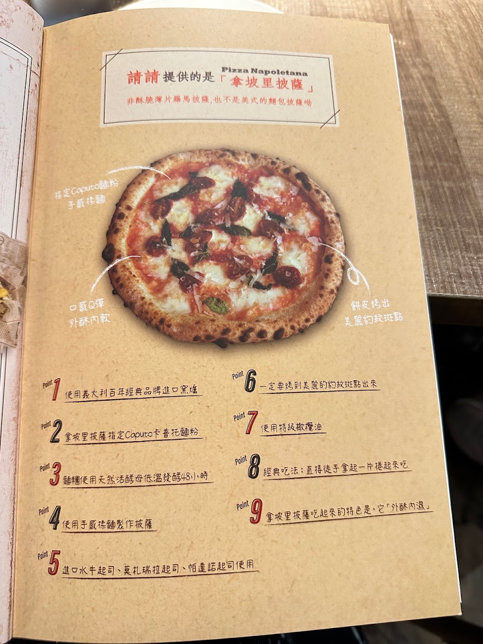 明太子魚卵辣味海鮮披薩$358:以白醬+起司+明太子魚卵為基底,主料海鮮其實就是蝦子與花枝,這些基底聽起來好像會有點膩,但因為食材品質夠好而且份量被控到位,擠上檸檬後吃起來只覺得味道豐富濃郁,令人滿足。披薩本身大概1.5人份,會看到師父拿一顆麵糰拉成餅後灑上料,再拿到旁邊火爐烤,拿坡里做法的餅皮確實非常好吃,外面一圈餅皮類似一般美式薄脆外面那圈酥脆,但中間的部分不是薄脆餅皮,而像義式麵包濕軟的口感,吃起來有微微空氣感,但沒有麵包乾澀卡喉的顆粒感,非常好入口。