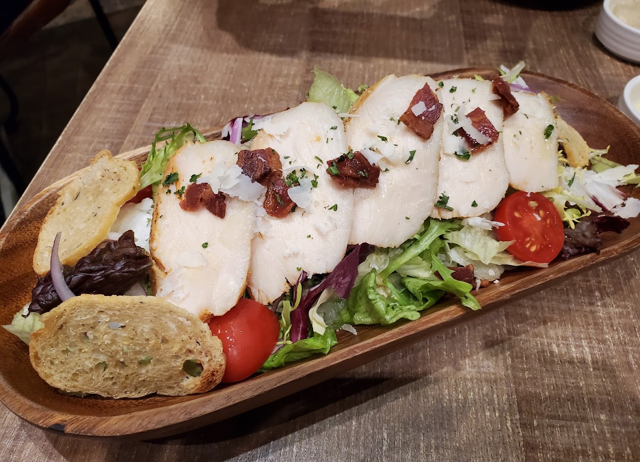 餐前麵包配上油醋醬很好吃,凱薩雞胸沙拉跟?表現中規中矩,義大利麵麵很有嚼勁很香,檸檬塔讓人驚艷! …