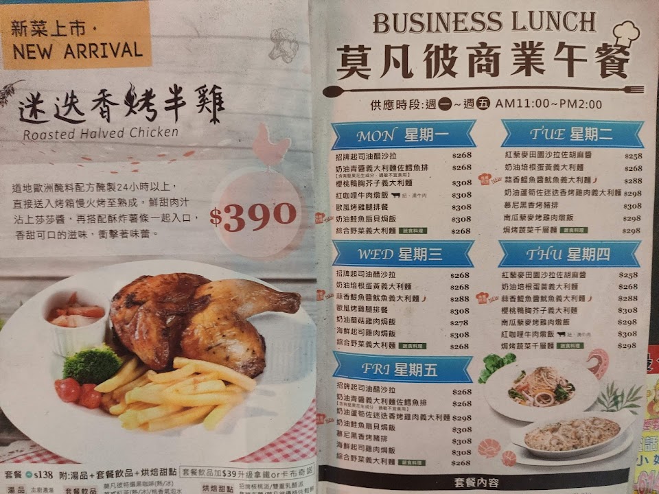 2021年12月19日,上網訂這裡的外帶,位在我家附近。訂了:雙人五品套餐,包括–北義奶油松露野菇燉飯、櫻桃鴨胸芥子義大利麵、青醬燻雞烤餅、招牌核桃派、莫凡彼優格佐鬆餅、蕃茄蔬菜湯、熱英式紅茶和熱莫凡彼特選黑咖啡。莫凡彼最有名的就是冰淇淋!2018/3/24(六) 全新改裝開幕,座位有41席。FB官網指出:位於風和日麗,鳥語花香的民生社區,整片玻璃借景於街道,明亮的採光!環境設計以莫凡彼沉穩的木紋色調搭配土耳其藍的時尚感,是個約會聚餐的分享好去處。