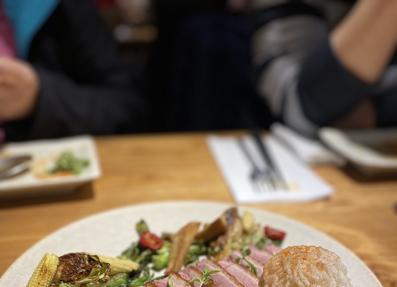 鴨胸搭配炸冬粉和烤蔬菜,整體香味十足