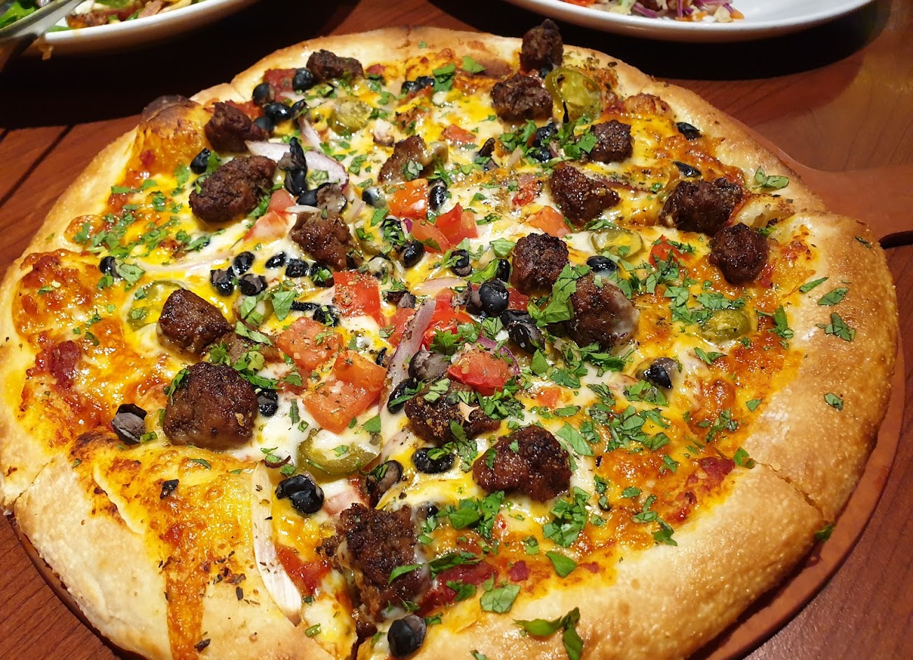 今天點了凱撒沙拉、臘腸蘑菇披薩、雞肉寬麵與必吃的BBQ烤豬肋排