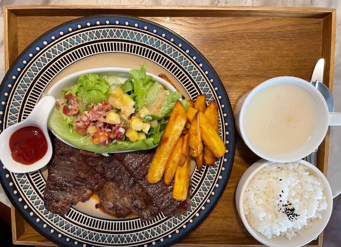 點了香烤義式番茄牛排套餐+炸豆腐。