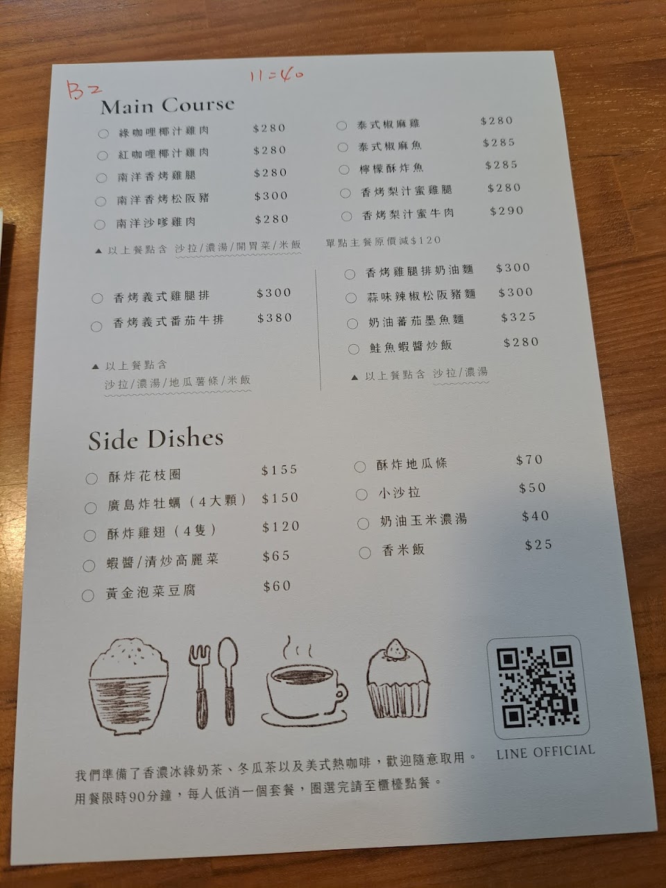 沒有訂位的話,到現場候位需要等上一陣子,因為店面較小、座位也少,但非常值得等待!我點的是「南洋香烤松阪豬」套餐,份量適中,主食配上南洋風味的醬汁非常下飯,小菜、沙拉、濃湯都非常美味 餐廳環境也很舒適乾淨!期待下次二訪品嚐其他套餐~