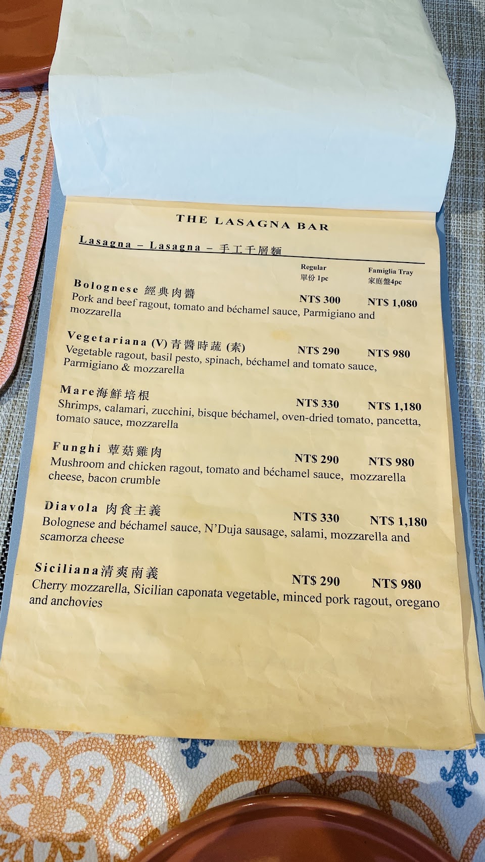 在社區的溫馨小館,店裡放著義大利廣播,千層麵味道正統,用料大方,價格也不貴一份大約280-320元。不定期會推出限定口味。義式冰淇淋也是每段時間換一次口味。