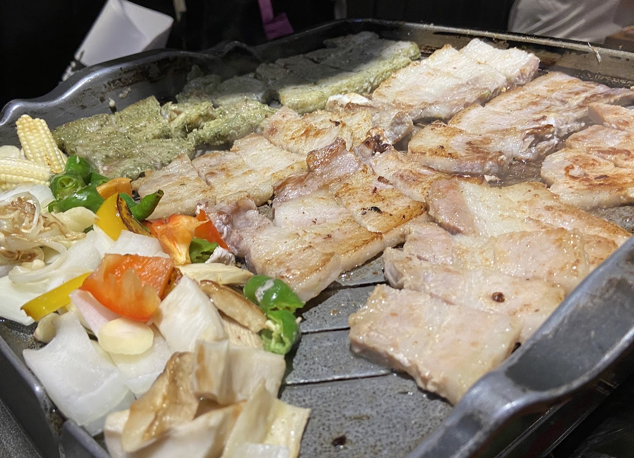 內容物有八種口味豬五花厚片、十種韓式小菜、蔬菜盤、辣味海鮮鍋,可加價(忘了多少約四百上下)鍋物升等韓式起司部隊鍋,每種小菜都可以無限續用,蔬菜盤同樣也可以,且有專人烤肉服務,基本上無需要自己動手,個人滿享受這樣的用餐方式