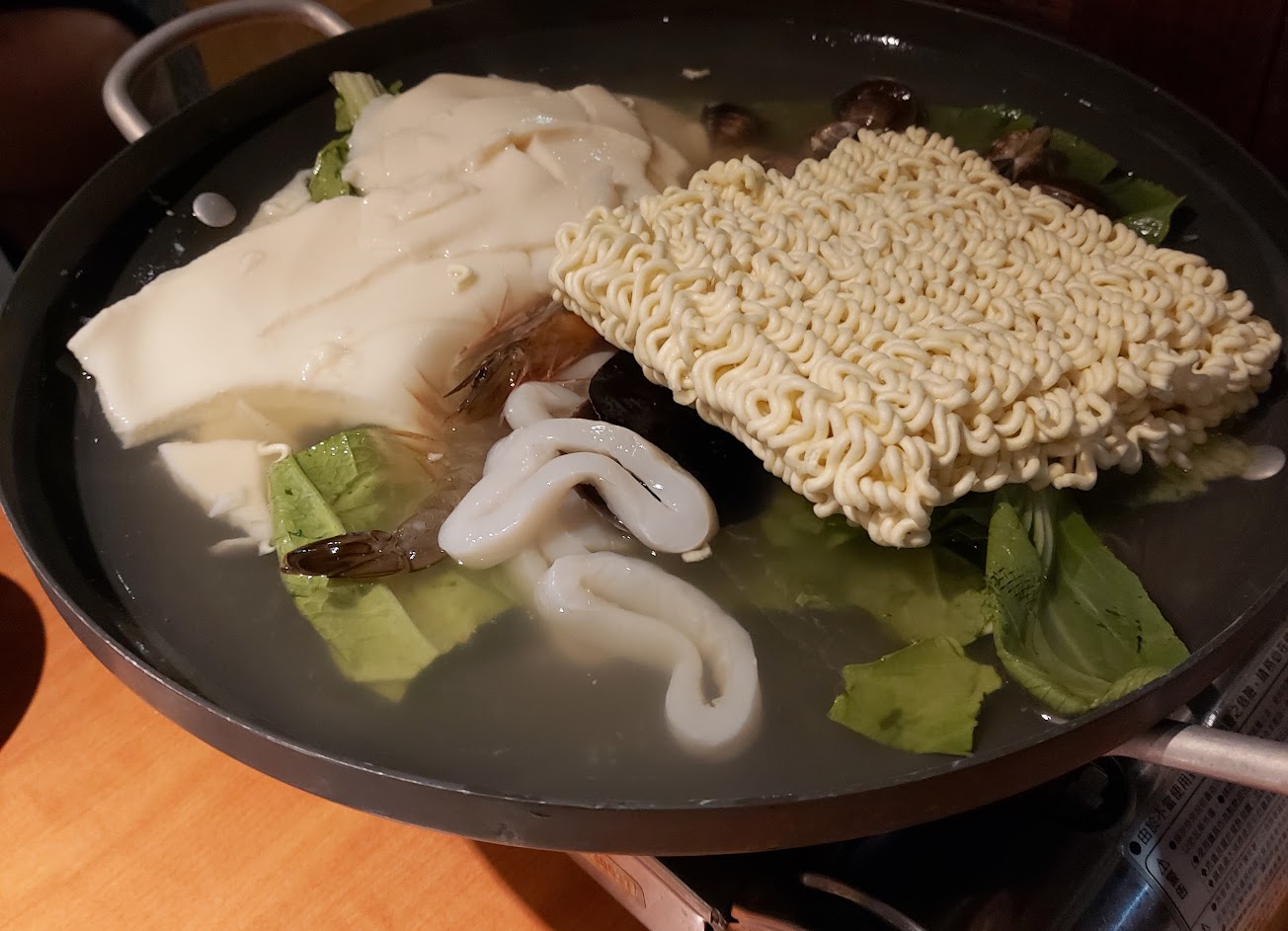 和友人點了雙人1680套餐,生菜非常新鮮,牛肉表現很好,份量也很足,反觀雞肉及豬肉稍嫌雞肋,雖然味道也不差,但僅僅幾塊有點虧;年糕口味很像路邊攤,柴魚味很重;辣炒豬肉則欠缺辣勁,吃完後只記得鹹味;海鮮鍋也幾乎沒味道,很無聊的鍋。