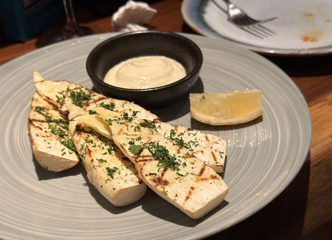 點了香料皎白筍、炸牛排三明治、氮氣馬鈴薯、海鮮飯,每個都很好吃,香料皎白筍的大蒜蛋黃醬超級好吃,店員讓我們加了一份配三明治也很搭!