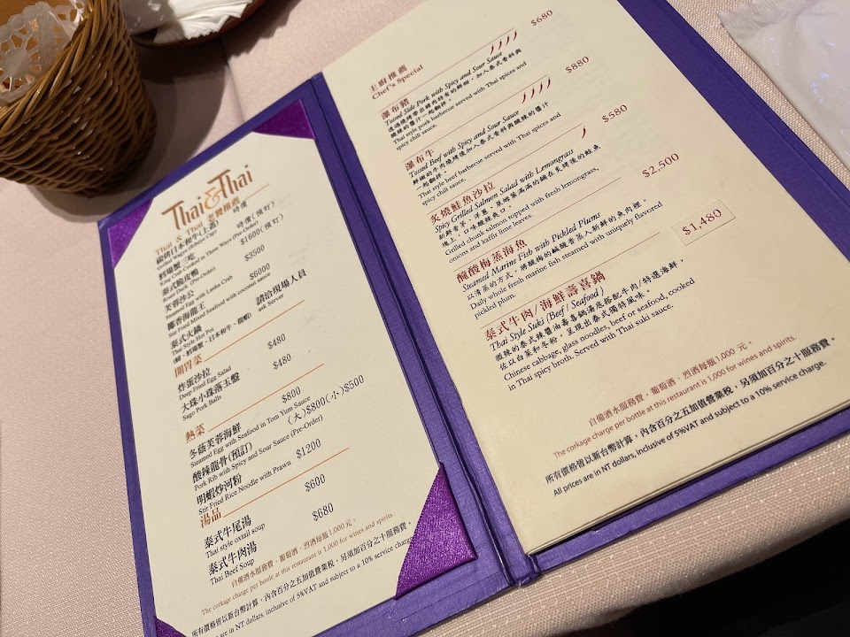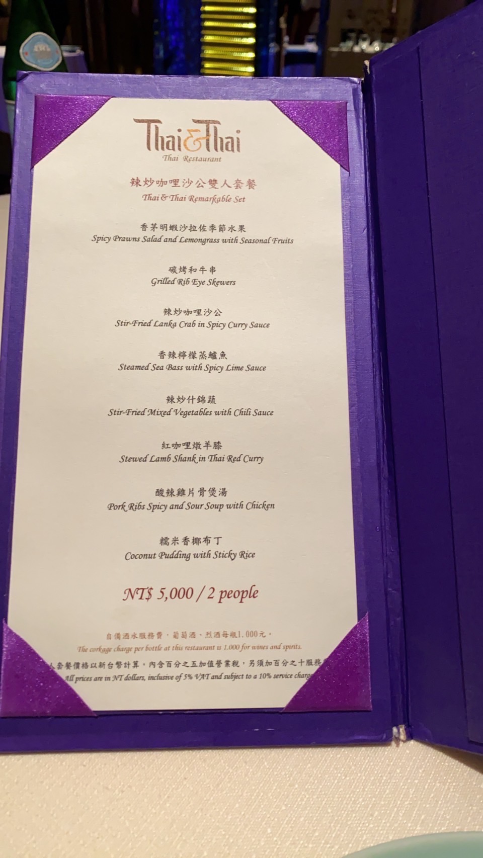 在東方文華五樓Thai&Thai 泰式餐廳,必點推玉米沙拉(隱藏菜單)、牛肉壽喜鍋、泰式香烤雞、泰黃咖哩、鮮蝦粉絲煲、七彩椰子綠豆糕。
