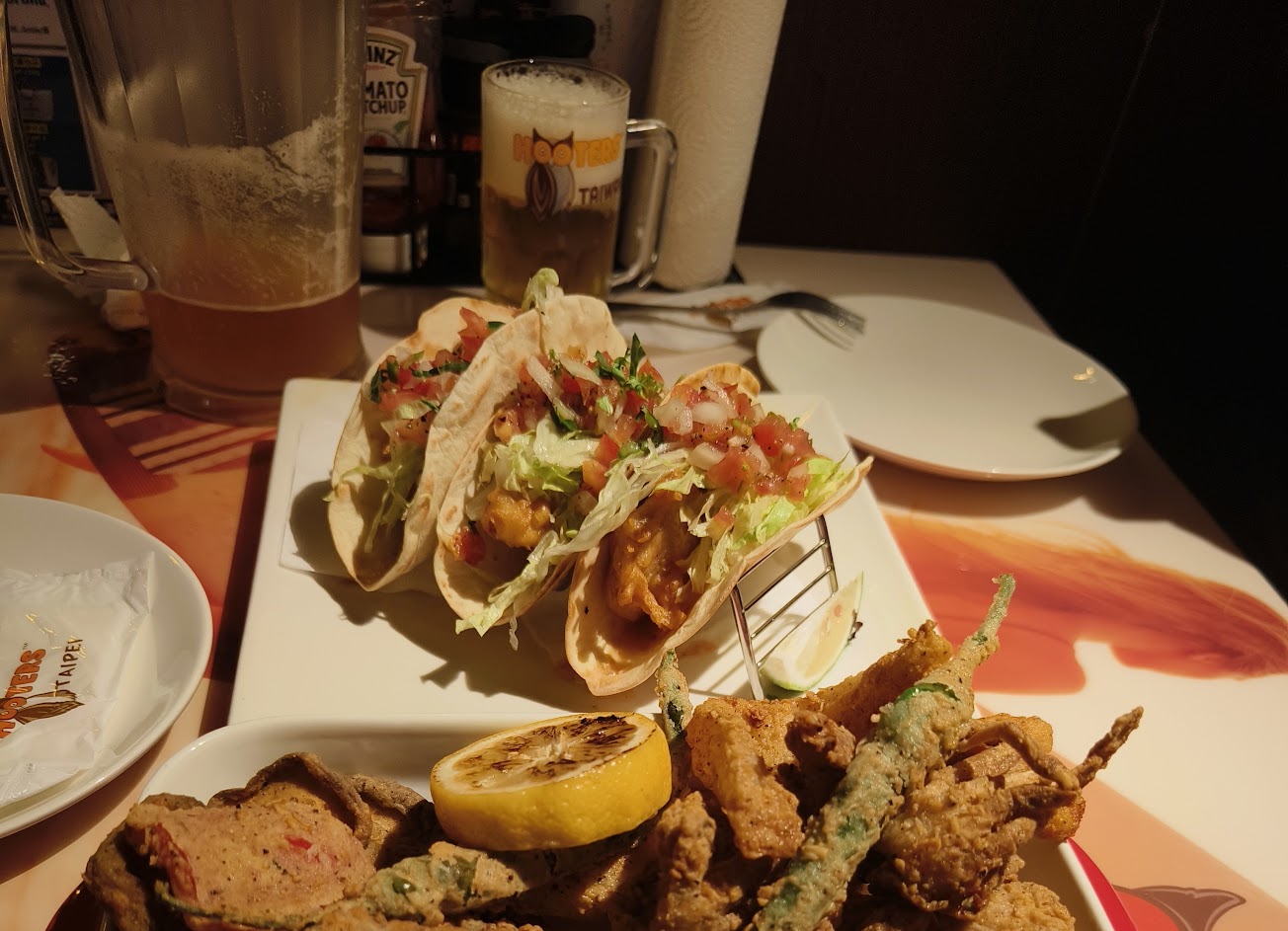 週五的晚上,十點左右的時間,找了一下有營業的店家,就這麼進來了。 其實這美式餐廳之前就去過其他分店,桌邊的位置幾乎被一堆男生們都坐了,剛好一桌離開,我們也就能坐在很近表演的位置,這次剛巧遇到有呼拉圈表演的時間,可以很近距離的看到他們賣力的演出。 來美式餐廳除了吃,一定也要來點啤酒,但太貪心了,兩個人一壺喝完再第二壺,最後喝不完,實在是也太撐了。