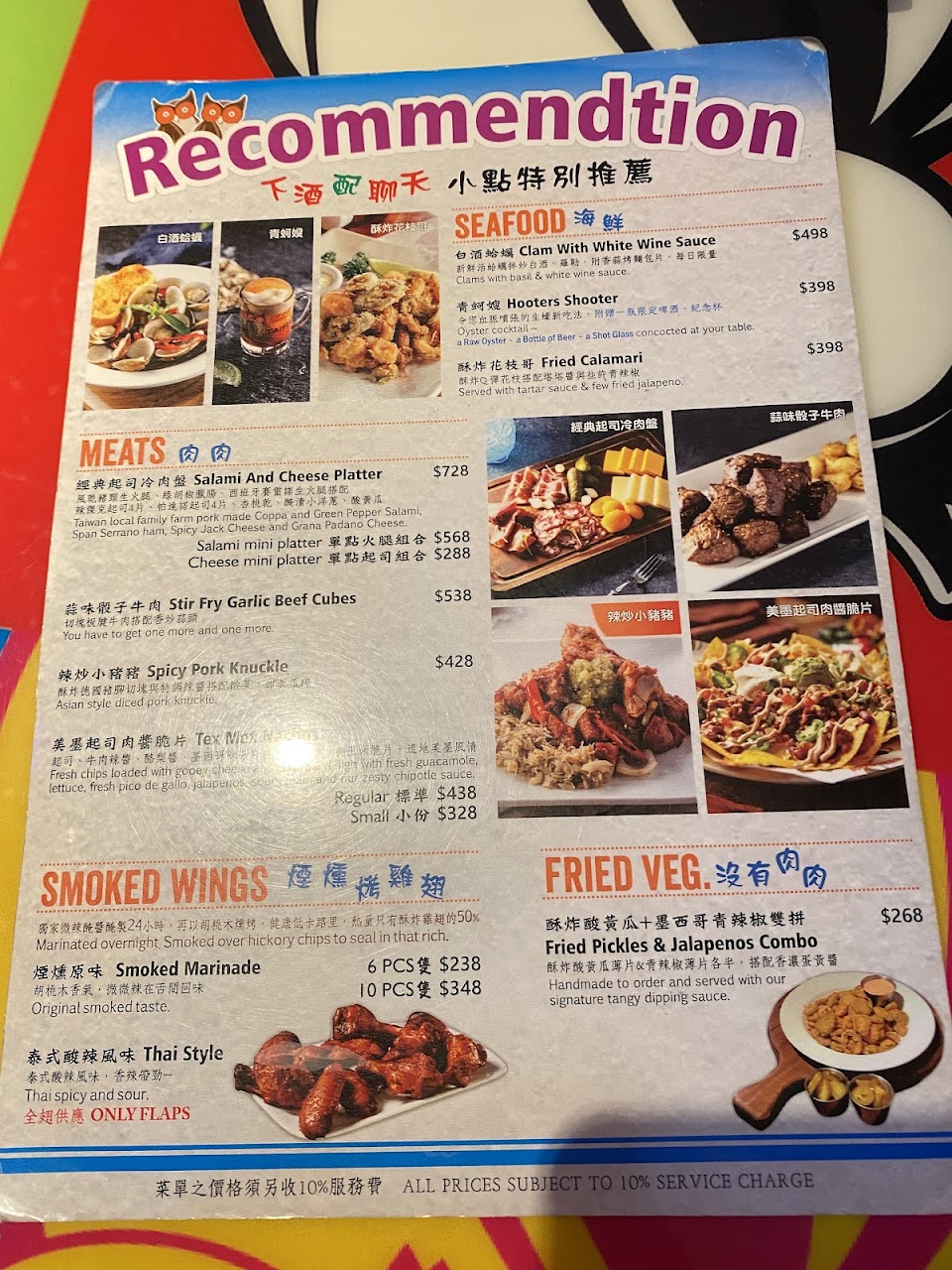 想吃很久了!雞翅 辣牛肉薯條真的讚 尤其是服務員Peggy 笑容超燦爛 超甜美 看別桌的服務員有些臉很想下班?就覺得我們很幸運? 餐點:5 服務:5 氣氛:5