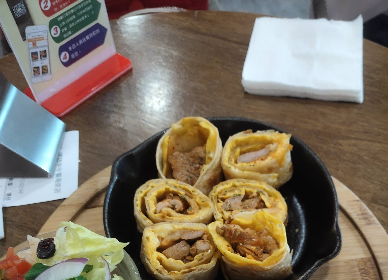 整體來說就是不錯的早餐,沒有到太驚豔。蛋餅特別的是外皮很脆,內餡就還好(今天點的是韓式豬肉、凱薩雞肉,雞肉夠嫩好吃)。