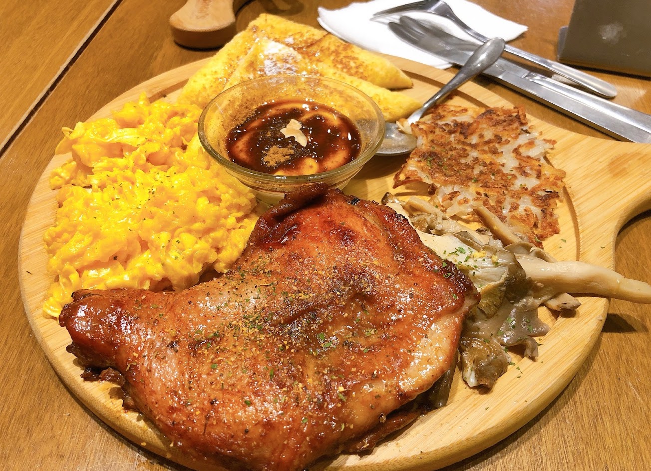 餐盤附手工美式薯絲煎餅+綜合野菇+黑糖優格+沙拉+法式土司,口味還不錯,雞腿是BBQ口味??,薯絲煎餅很特別很推薦?~綜合野菇是採用秀珍菇,黑糖優格很特別,酸甜適中,有戀愛的滋味(咦?)因為不吃沙拉的緣故,所以換到炒蛋,非常大量??,但是有點偏鹹,量非常足夠,覺得很滿足??
