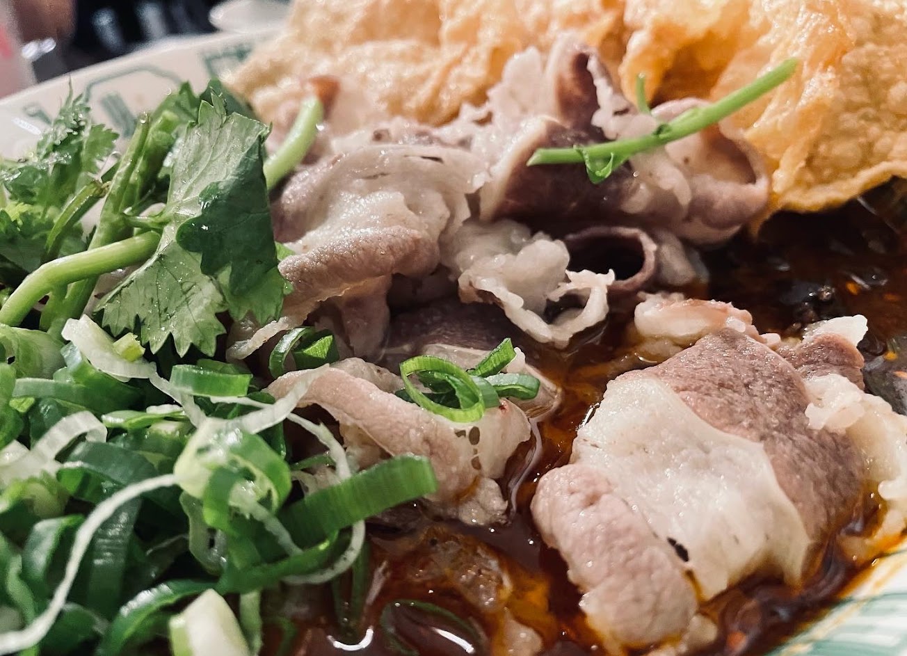 犇聚寶盆牛五花肉好老、牛筋沒有煮透很硬又沒味道,牛肉丸尚可,湯頭帶酸還蠻開胃的。相較之下,脆脆皮和肥腸表現好一點,但也沒有網評所謂的神好吃,油雞本身沒什麼味道,又泡在湯麵裡,更相形失色,另外的擺盤可能會好一些。