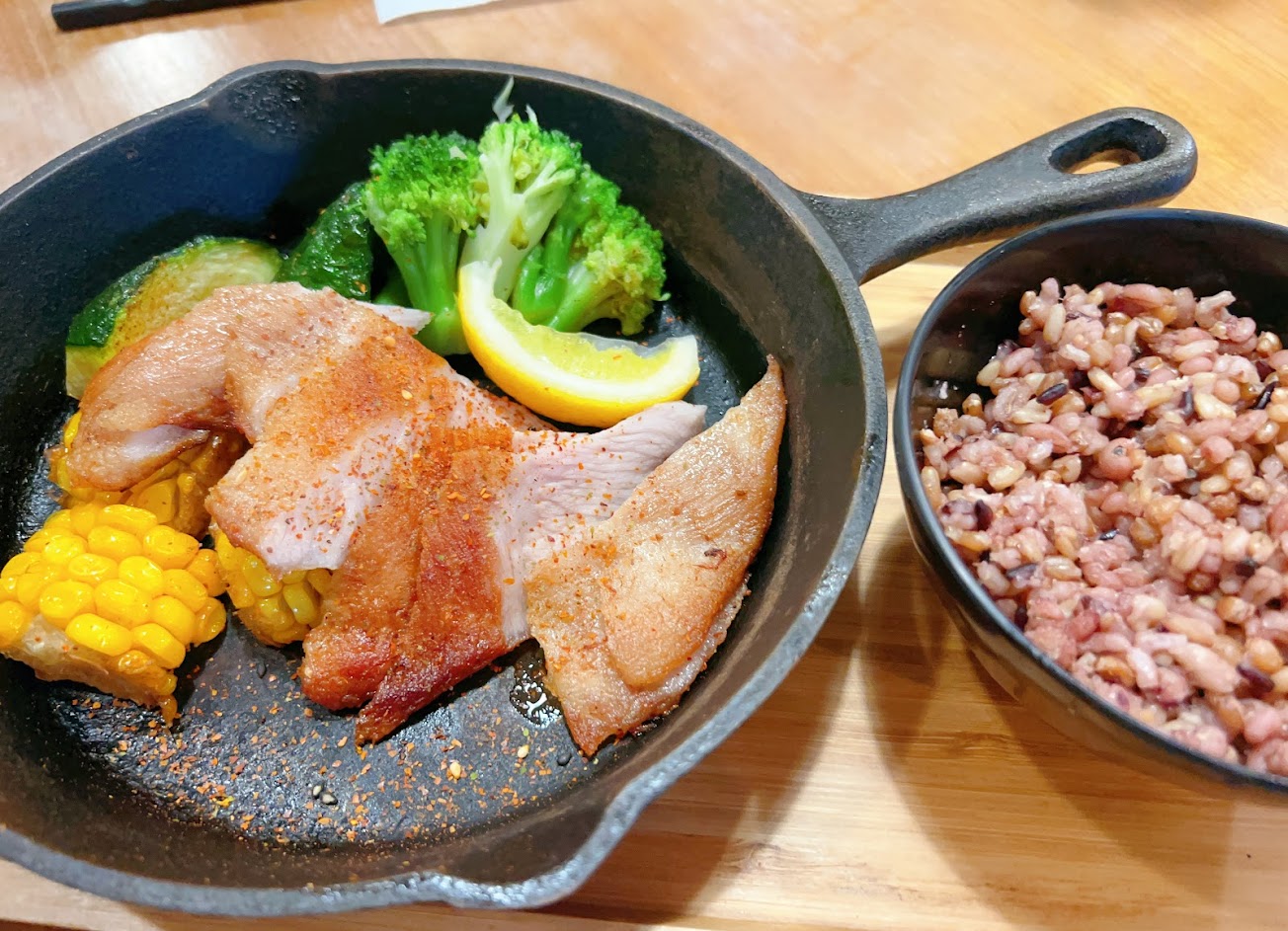 蔥鹽醬調味很好,搭配烤蔬菜(玉米筍和櫛瓜)及很有嚼勁的五穀米