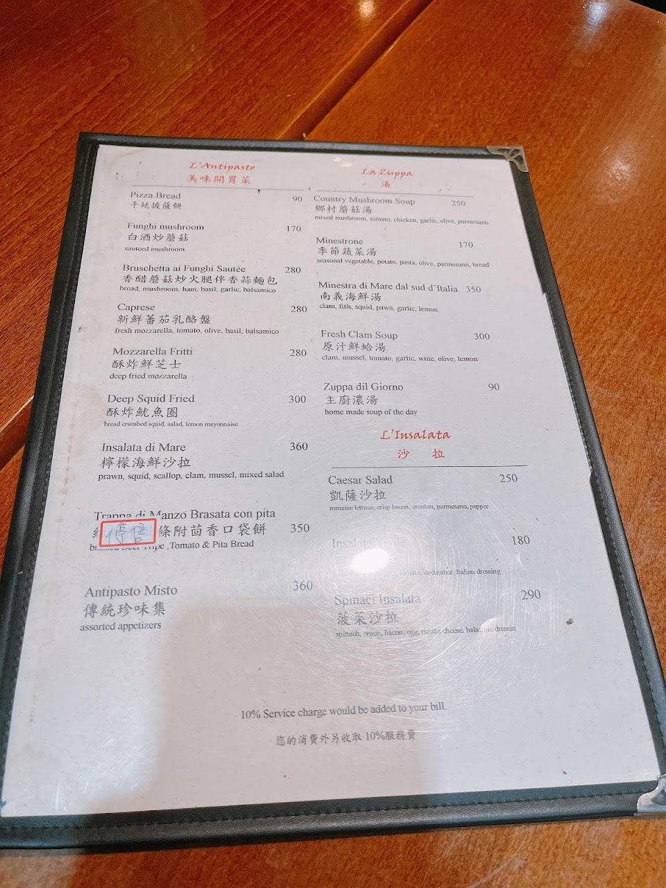 午餐消費模式與晚餐不同。 付款方式可以選擇刷卡或是現金。 需加一成服務費。 午餐方面:提供$200~$480元不等的主食餐點。附自助沙拉、餐前濃湯及餐後飲料。 例如:白酒蛤蜊麵、紅醬雞柳麵,或是不在菜單上當日菜單:青醬蝦燉飯($300元)、紅酒牛肉燉飯($300元)。 主食決定後,中間區域的自助用餐區可以依各人喜好取用,基本沙拉盤,淋醬通常提供兩種可以選擇,其中一盤菜色會較特別,有遇過手工披薩、烤整隻玉米筍、醬炒高麗菜。 餐後提供的飲料,奶茶非常推薦! 晚餐方面:少了中間自助沙拉區,餐點走單點模式。