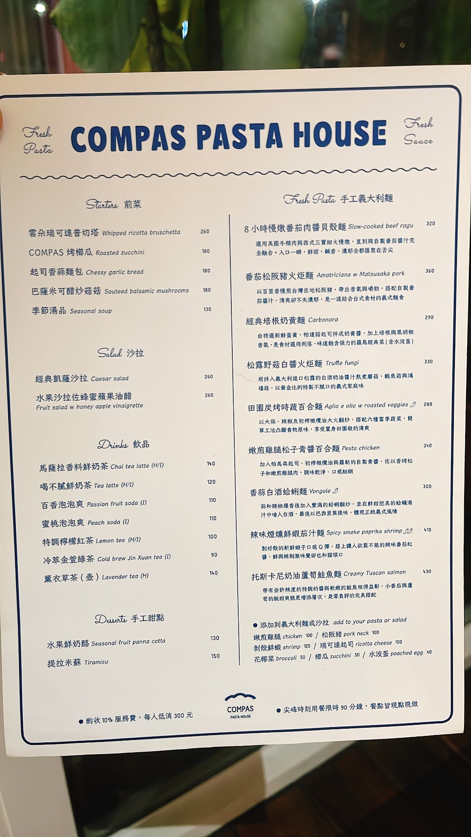 今年跟朋友慶生日吃 @compas.pasta.house !!! 就在八德路上一間透明玻璃屋的餐廳 麵條是店家手工製作的 偏硬但是是有嚼勁、口感的麵條? 個人很喜歡這種口感✨ BTW店員人都超好? 除了幫我跟朋友冰蛋糕以外還會詢問我們餐點如何 大家真的可以來吃吃看?? / 我點了本月主廚限定的#蒜辣紐約客牛排義大利麵 ?$420 我還特別問了是什麼醬因為從來沒吃過這種口味!!! 是巴薩米可醋加上蒜香調味還有節瓜意外好搭? 郭點的#經典培根奶黃麵 ?印象中是$260(?) 一開始我覺得味道偏淡但加上培根一起吃 鹹度剛剛好!!! 連郭☁️都吃光光?? 我們兩個的麵條不一樣 我的比較特別是百合麵 吃起來有較勁而且都有味道? 飲料我們點了#焦糖海鹽鮮奶茶 $130跟#百香泡泡爽 $90 原本我到月底都不喝茶類 結果喝了一口奶茶直接跟朋友說我要喝 雖然偏甜但我覺得很好喝? 泡泡爽超適合現在而且跟義大利麵也很搭? 啊對了我們有加套餐(+150) 含一份今日甜點跟一杯$90元飲品 甜點我們選百香果奶酪好吃到全部被朋友吃完?