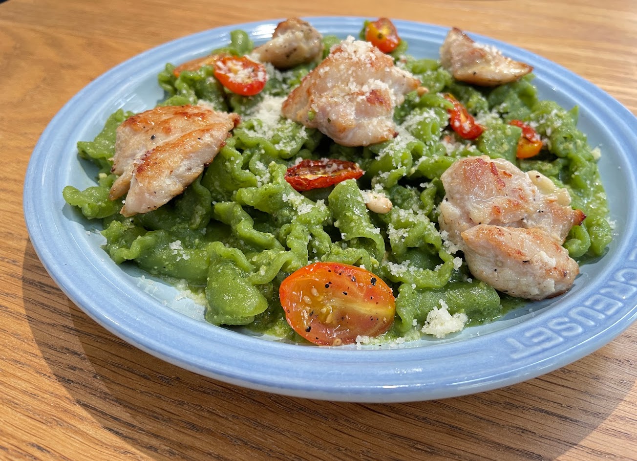 很喜歡他們家青醬,吃完不會膩口!而且每口麵都有醬汁巴著♡ 雞腿肉也煎得很嫩很香