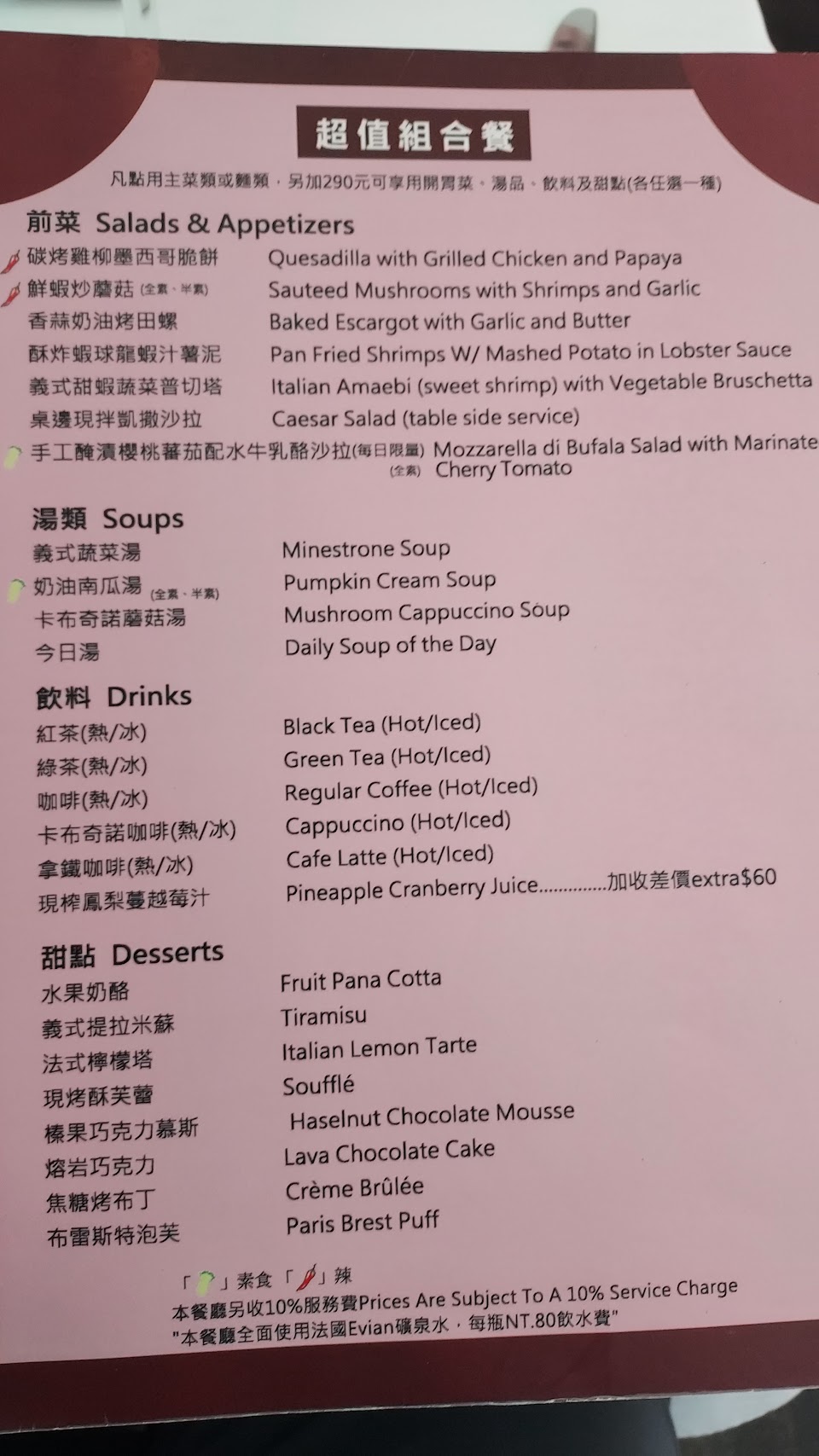 加購套餐會附沙拉或今日例湯(二選一)、飲料、甜點