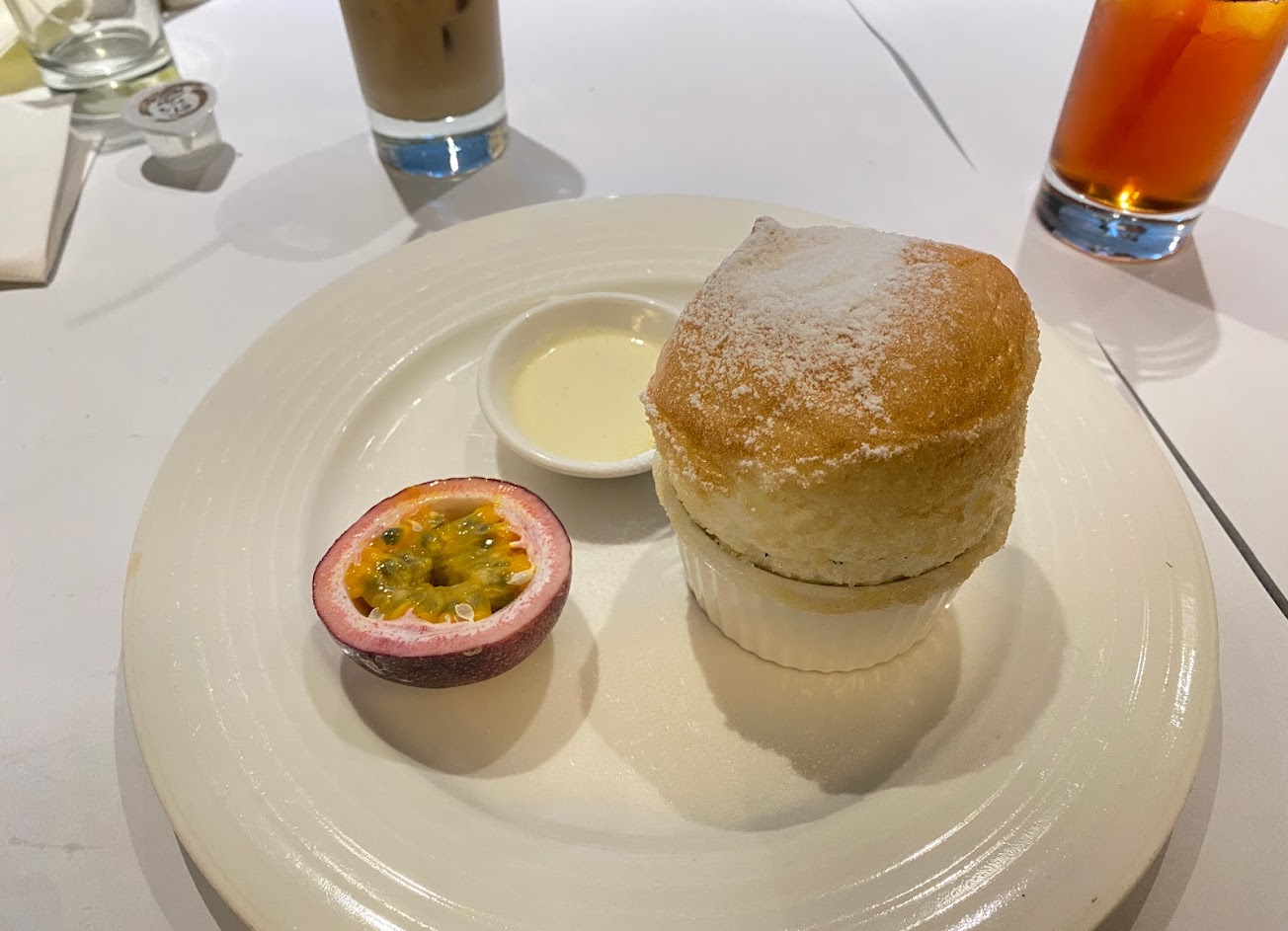 現烤舒芙蕾:這道菜很考驗功夫 很少餐廳會賣 這也說明了 這間餐廳30年不倒的實力 鬆軟香甜入口即化,果香及煉奶更提升了酥芙蕾的口感、百香果的微酸,完全不膩口,個人很推薦