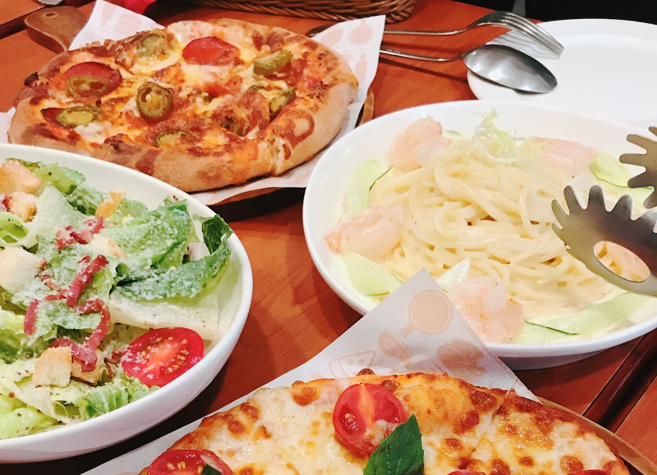用餐環境整潔寬敞有氣氛,覺得義大利麵好吃,披薩味道覺得有些淡,不過多樣蔬菜的利用很不錯,服務人員好像不多,上菜速度還ok,價格以相同種類餐廳來說算合理,還會再來嚐試其他的菜色。
