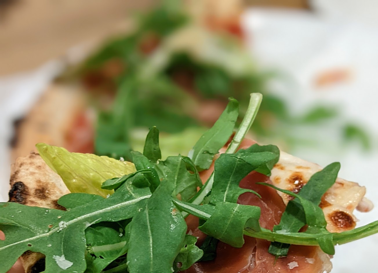 我們點了布拉塔奶酪、火腿和鳳尾魚披薩,它們都很棒。我們還點了一份沙拉和一些蘑菇湯。沙拉里有蜂蜜油醋汁——非常美味。