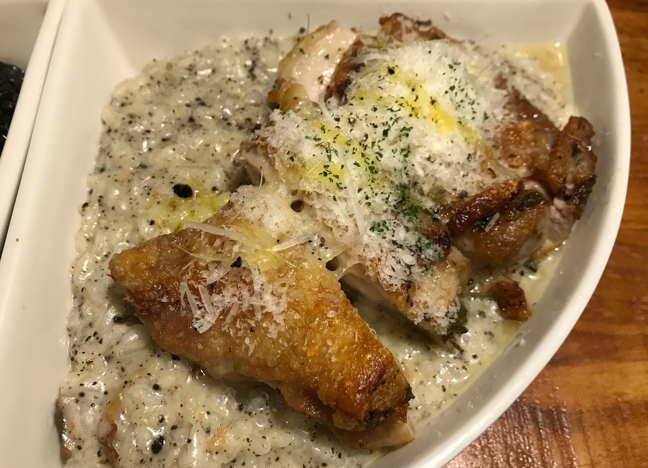 奶油野菇燉飯超好吃! 菇味很濃,混合奶油之後調味令人驚艷 但雞腿排就非常普通,也沒什麼調味可言 只靠起司粉在撐 青醬燉飯也很好吃,醬一樣很棒 配上杏仁片很搭,增添了口感 麵包也很棒,熱熱的,並且很蓬鬆 沾橄欖油還不錯 平日晚上來最好也要訂位 不然可能被丟下一句因為不限用餐時間 所以無法確定什麼時候會有位置 另外餐點不算便宜 兩人隨便吃都要九百