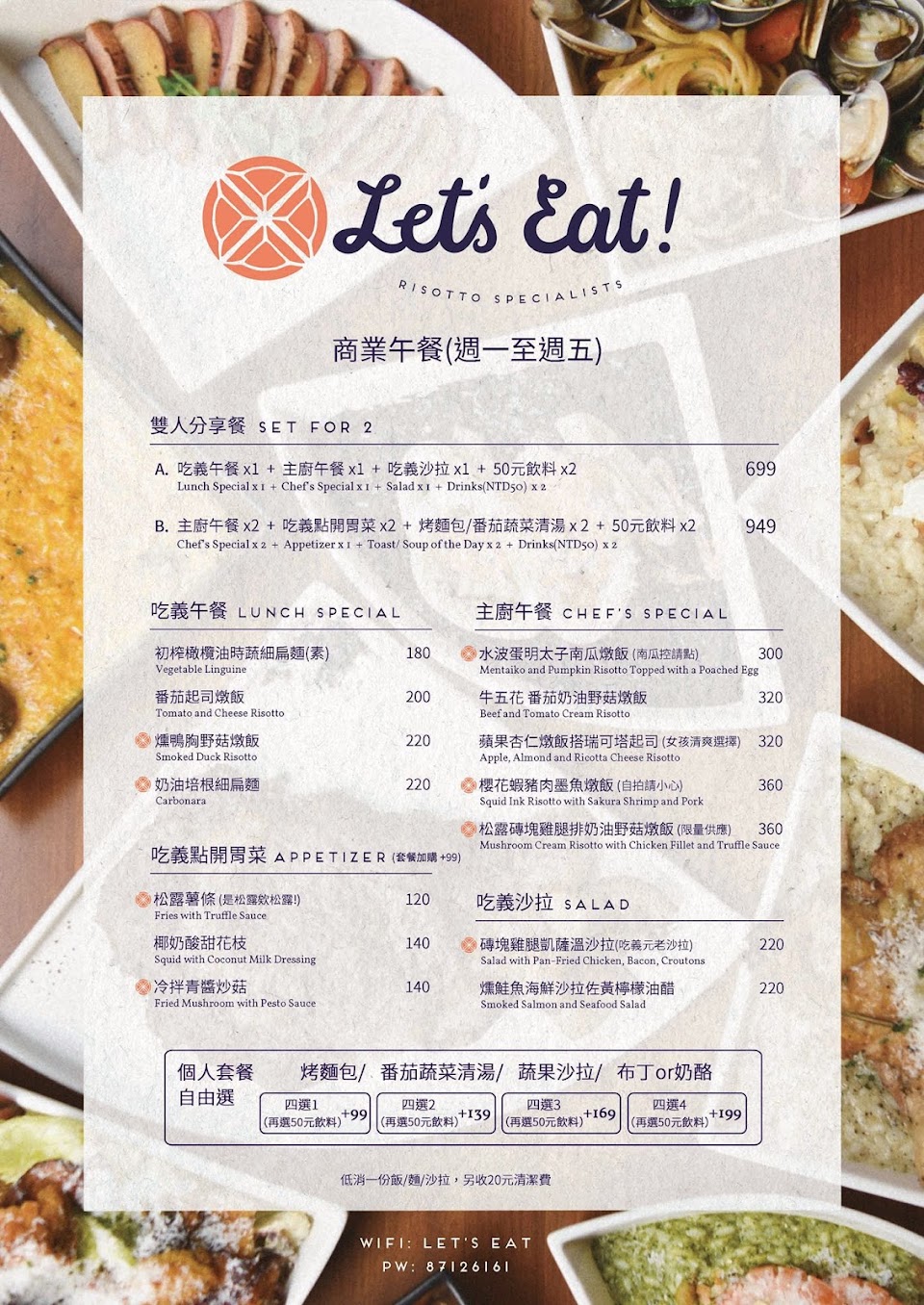 雙人套餐樣式多,是義大利米的硬米心,調味不錯,也未限用餐時間,還會想再吃的店!