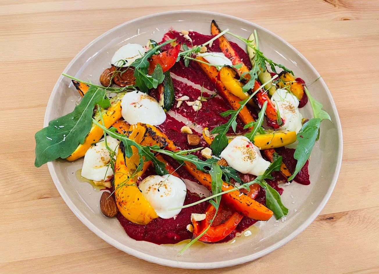 今天來用餐,覺得「起司烤季節蔬菜」讓人感覺很驚豔,用甜菜根磨成泥再搭配堅果的口感,烤蔬菜搭配甜菜根泥帶著清香爽口的感覺!
