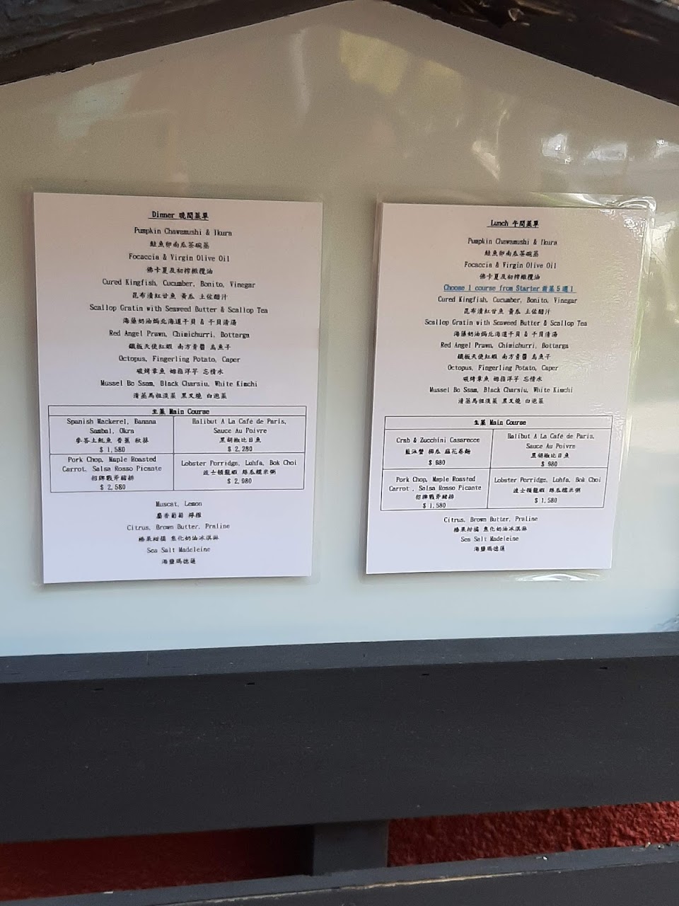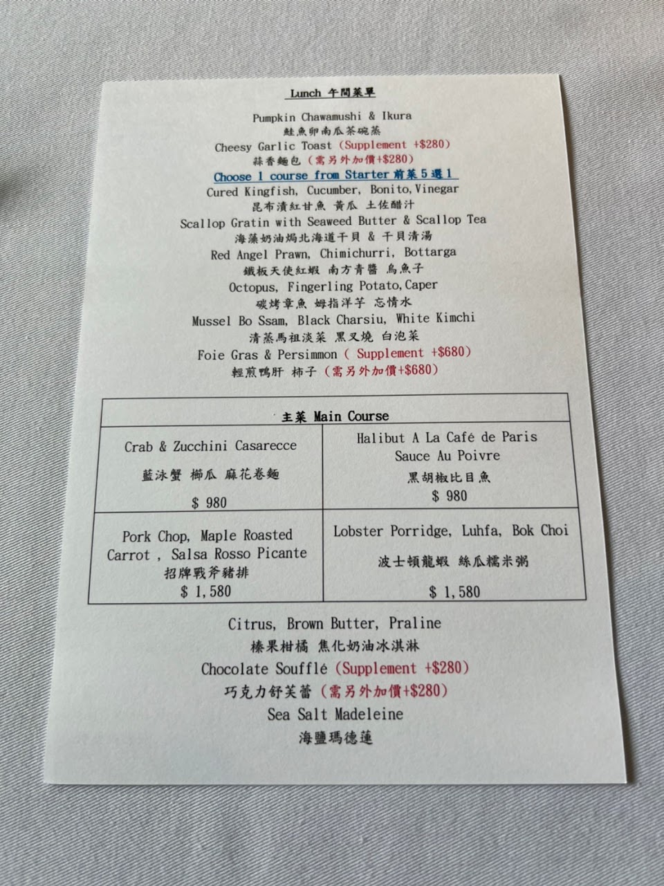 從茶碗蒸開始就丈二金剛摸不著法餐頭緒,每人一片focaccia( 是義大利麵包代表),鮪魚丁和醬汁完全不搭的不知所云,澎湖小卷塞了靑花椰,干貝那道叉子完全下不了手,吃到淡菜叉燒真心覺得需要被救贖,主菜的戰斧豬排,直接對半切的燒烤胡蘿蔔配菜很無言,豬肉調味一般,好吃的反而是上面的小蕃茄。 前甜點只想嘆氣,巧克力soufflé 標榜用70%可可製作,所以無法表現正統souffle 蛋白麵粉融合的蛋香綿密口感⋯⋯最值得稱讚的是Madeline, 有水準。