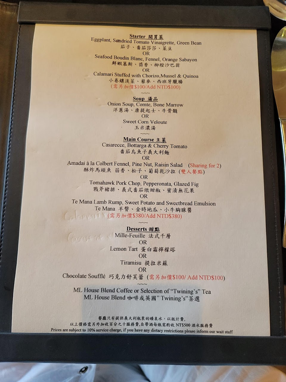 以為是法式料理、但這應該是「台式西餐」、或屬於近年來人人趨之若鶩的號稱fusion的創新料理但實為confusion ( 引用近日Pierre Gagnaire大廚接受記者採訪時所說的經典名言 : FUSION is CONFUSION!!!?外場只有兩個人,一個主管+1個服務生,廚房四個人+1個洗碗,人力非常的精簡,以收費標準、及食材等級,餐廳利潤應可如期達成。 人均吃下來每人近$3000,這個價錢只有加了$280為了要有生日蛋糕點了Souffle. (因為餐廳並沒有免費提供給壽星任何的慶生小點) 沒有點任何的加購(點菜的服務人員會很貼心的建議你不要加購,因為會吃不完,但這樣菜單上還要放的原因?)也沒有點酒、水資一人$100,服務一般,沒有桌邊服務。