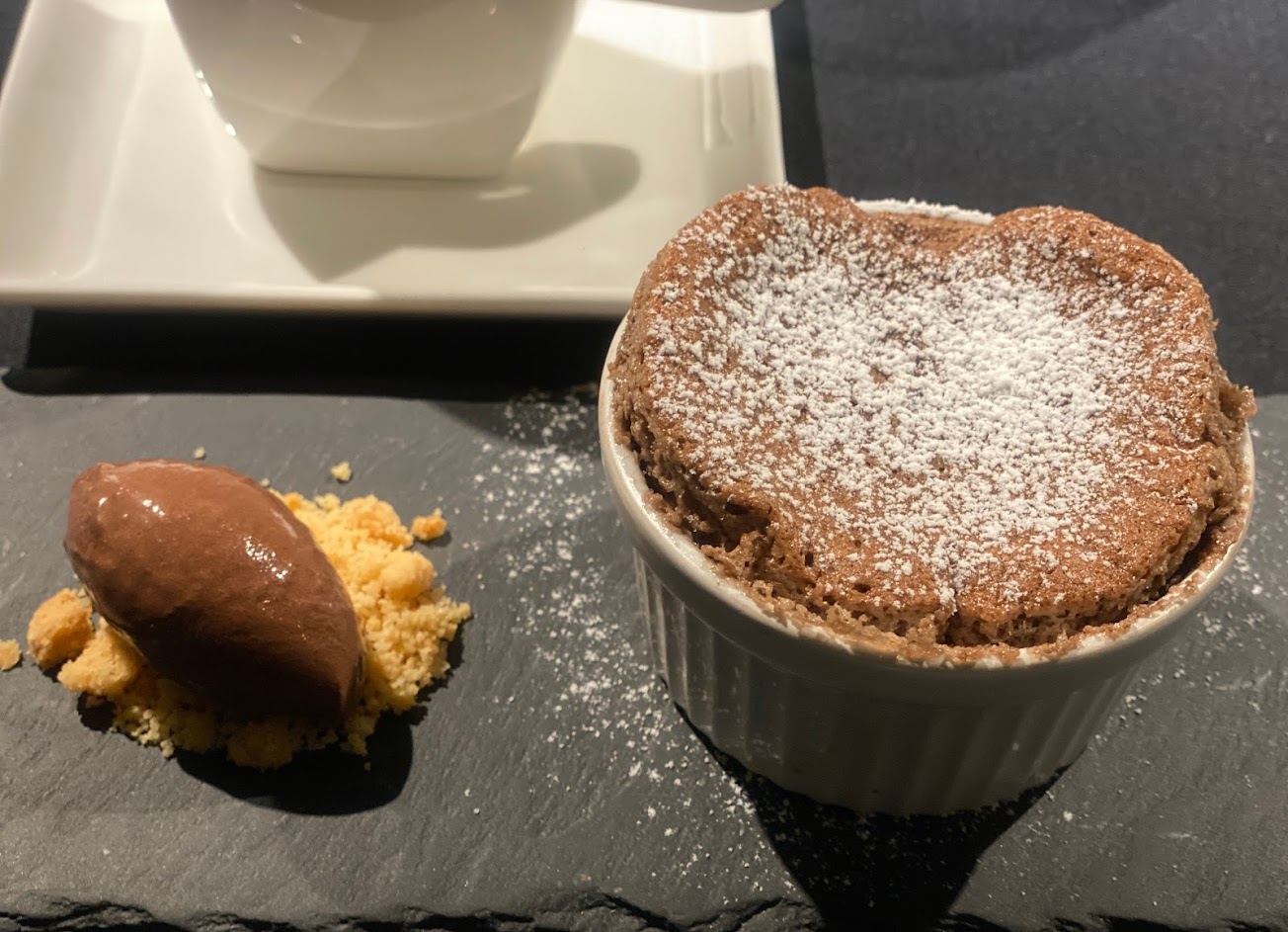 身為米其林餐盤推薦的法式料理,這個價位跟飽足感十分令人滿意,加點的蒜味麵包有黑松露奶油調味,香味十足且麵包外酥內軟;戰斧豬排約莫11盎司,真的吃不完?,巧克力舒芙蕾加上香草冰淇淋跟奶油,吃完有滿滿的幸福感~