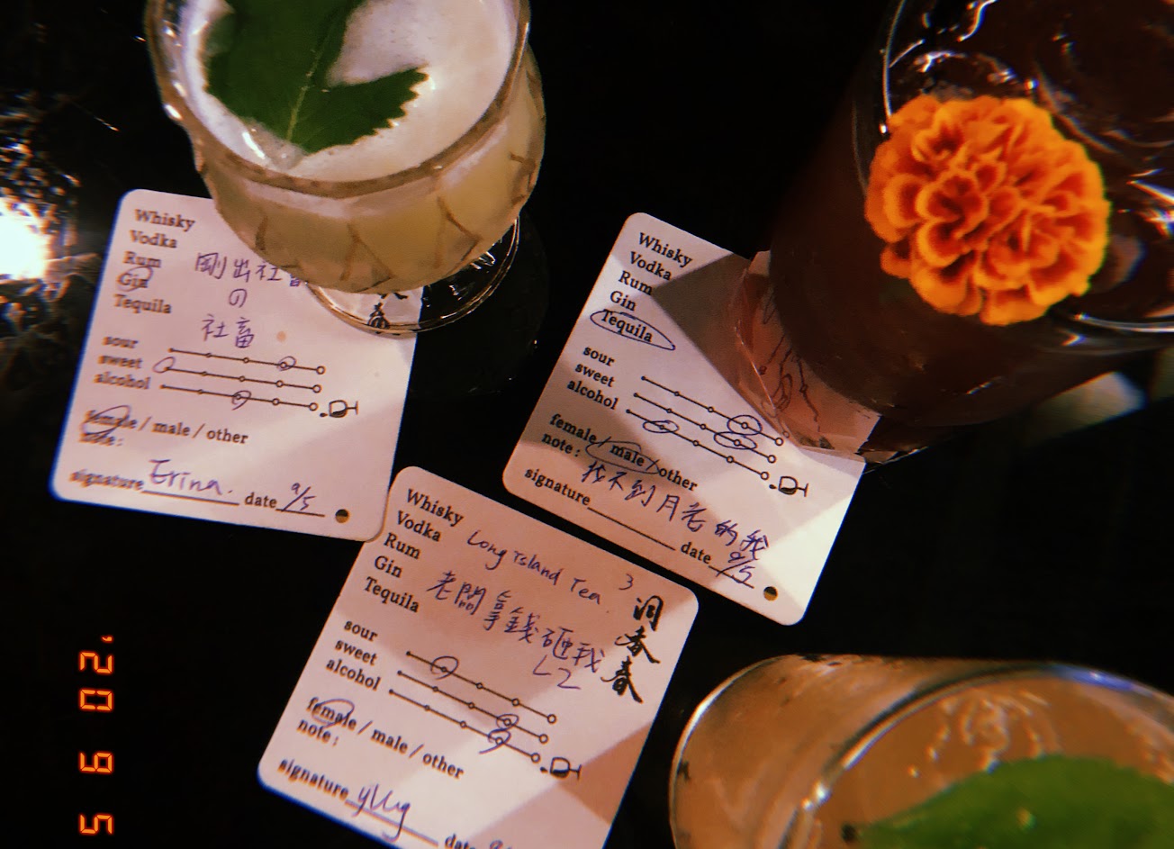 蠻喜歡這家店的點酒方式:可以自己選擇酒的基底以外,也能客製化酒精濃度、酸度、甜度等,根本比擬手搖杯;更具特色的是,你還能在點酒時用文字寫下自己的心情,讓調酒師為你挑一杯適合你的酒。最後,這個點酒單還成為杯墊,也能帶回家當紀念,有吃又有拿(台語)