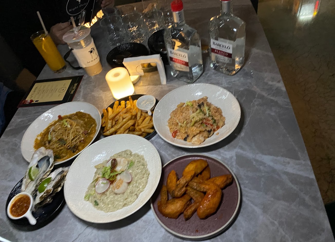 不誤正夜Night Duty餐酒館,在靠近松菸的市民高架下,餐酒館的外觀總是會讓人覺得神秘,到餐廳用餐區前有塊拍網美照的佈景,用餐場地一樓與地下一樓,空間很大,調酒吧台滿滿的酒種,最吸睛的是放置特調的杯架,不誤正夜的餐點真的讓人非常驚訝,食材新鮮,那大生蠔不是只有好看,還很鮮甜,熟食的燉飯與義大利麵味道極佳,不是只是單單喝酒,還可以品嚐到美味食物,調酒更是吸睛,視覺衝擊強口感也很順口,非常適合找一群好友下班後的晚餐加小酌好地方。