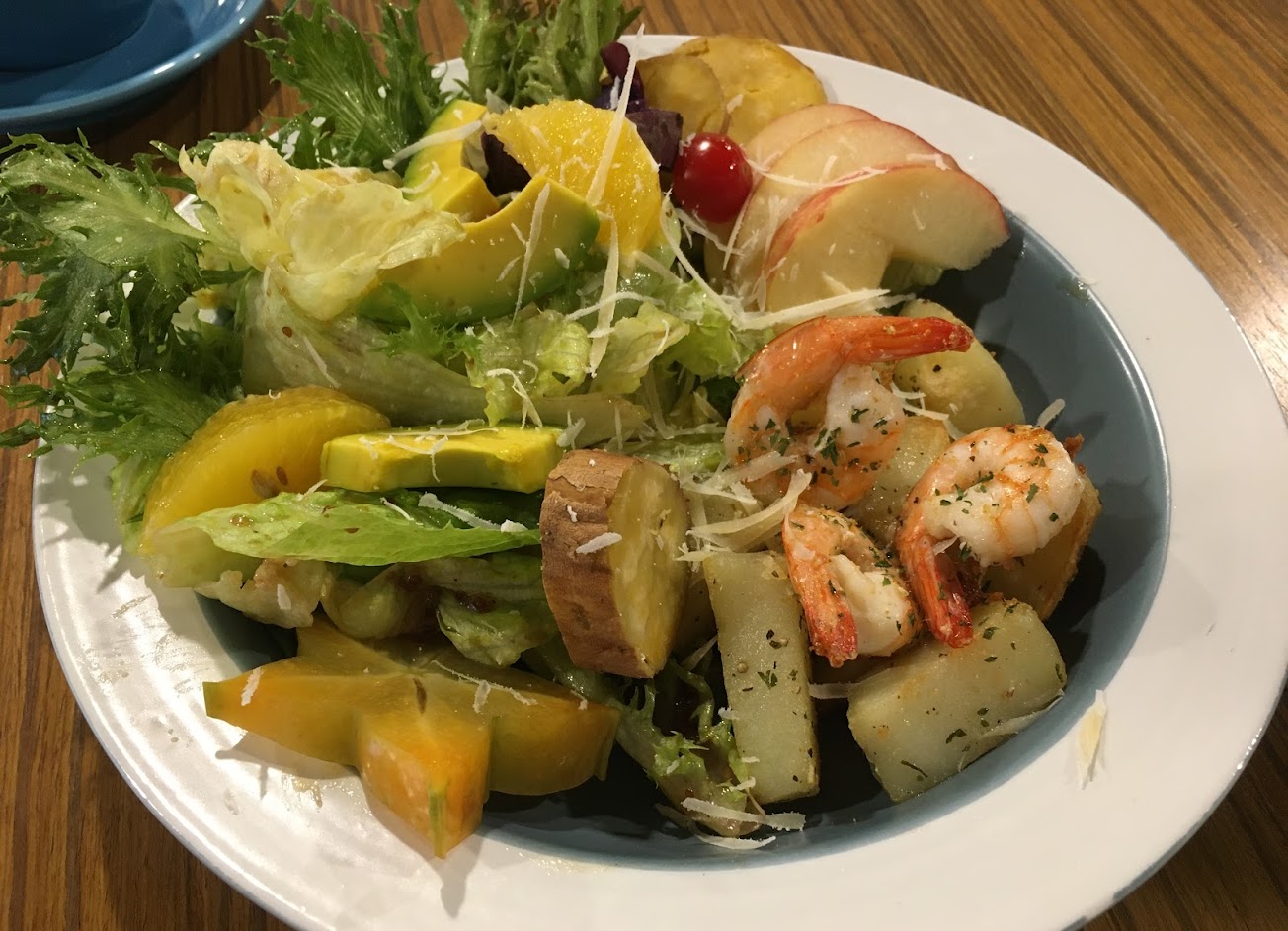 今天吃凱撒沙拉和法式鮭魚鹹派,驚人的美味!食材新鮮是基本,調味恰到好處,完整展現食材的鮮甜,鹹派更是特色料理,非常紮實好吃。此次最驚天動地的是沙拉中的馬鈴薯塊,外酥內鬆軟,吃得到焦香脆皮,裡頭是綿密鬆滑,和女友搶得你死我活。