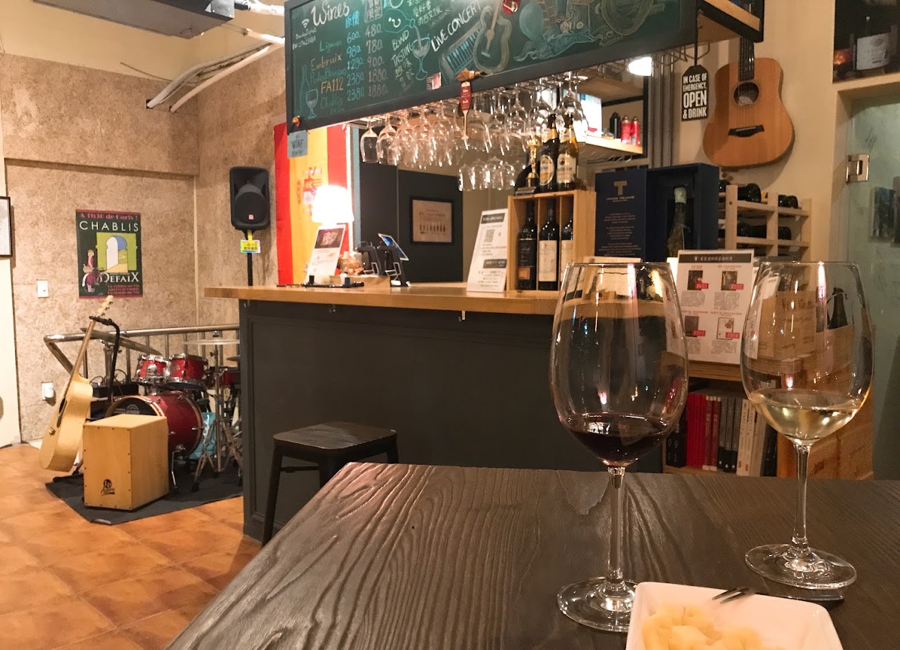 一個葡萄酒單杯很便宜,的wine bar,西班牙酒很便宜、種類也非常多樣化,法國酒也很推薦,現場還有爵士鼓演奏可以欣賞(但是隨機的!)。 非常適合想要來喝一杯葡萄酒或是嘗試很多不同類型葡萄酒的人來,每一杯的單價大約就是一支酒的牌價除於8~10杯的價格!!