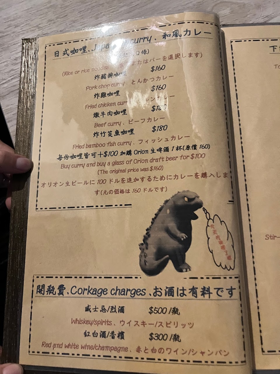 主食是咖哩飯還有烤物/炸物/下酒菜可以點 菜單厚厚的 只有第一頁是食物後面都是酒單? 一開始沒注意以為拿錯本?