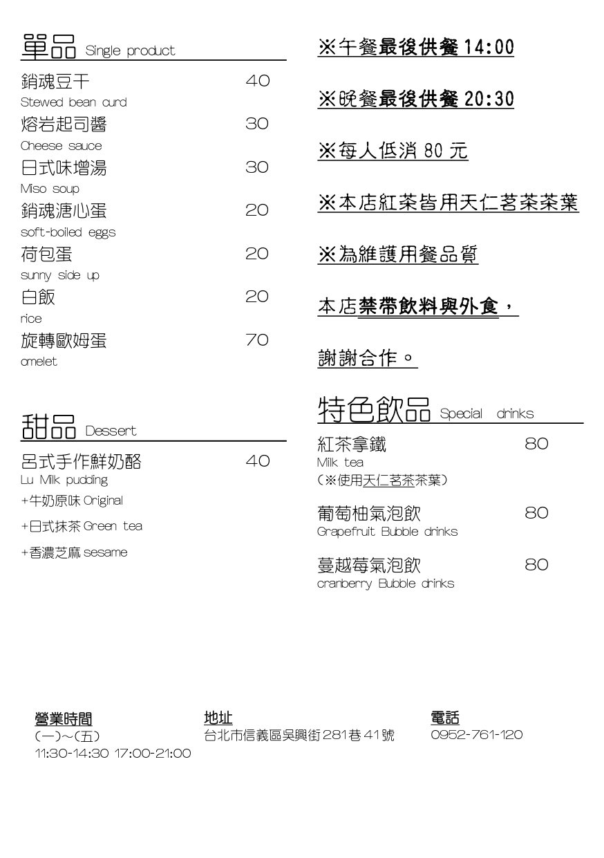 | 星期一 | 11:30–14:3017:00–21:00 |