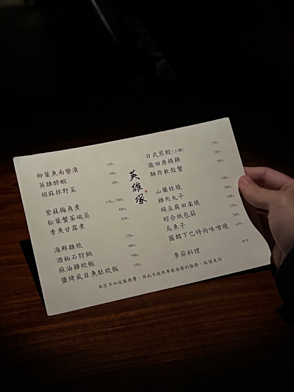 天色灰暗,適度的秋天微風,街道兩側停滿摩托車及汽車,遠遠看去幾家住戶家燈尚未熄滅,有六個人正等待進入”英雄塚”用餐,11:30準時有位服務員開門接待,入口是三合院的矮門,必須彎著腰方能進門,進門後有一小段玄關,彷彿金字塔密室的通道,燈光此時已是微暗,微妙的好奇心及探索慾細膩的融合在我倆全身心,繼續往前走有個彎處,來到了一個貌似泳池附設的烤箱空間,是等候區,前方木板上用小字寫著幾條規範,其中兩條已經顯示餐廳細膩且想傳達感受度的文字,兩條是這麼寫的”禁止說英文” “禁止兩人以上用餐”,當然,因為這裡是住宅區的關係,聲音是被禁止放大的,此時我已經迷失方向,因為還有兩道未標示入口指示的木門,一個在左一個在右,顯然這冒險慾望相較迪士尼鬼屋也不為過了,我們推開右邊的門–全黑,一瞬間只看見9盞聚焦的鹵素燈像照著畢卡索畫般照在木桌上,久久未回過神來,這時候才出現另一位接待員把我從虛幻的世界拉回來,這短短的15秒路程,我走過埃及密室,又經過桑拿室到羅浮宮,這餐1800元的消費已經值得。