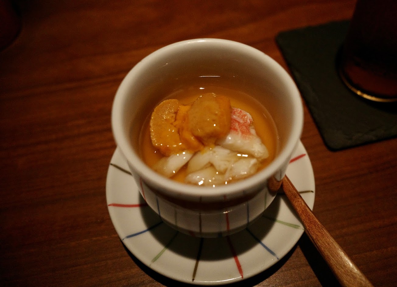 如果是一個人前來,或跟有好感的朋友,需要安靜的餐廳第一次吃飯這裡非常有氛圍感,室內光線暗,店員上菜收盤的卻很優雅,也有許多酒品可搭配下酒菜選擇,季節限定的水海膽很驚艷,喜歡海膽的朋友一定要點來試試。
