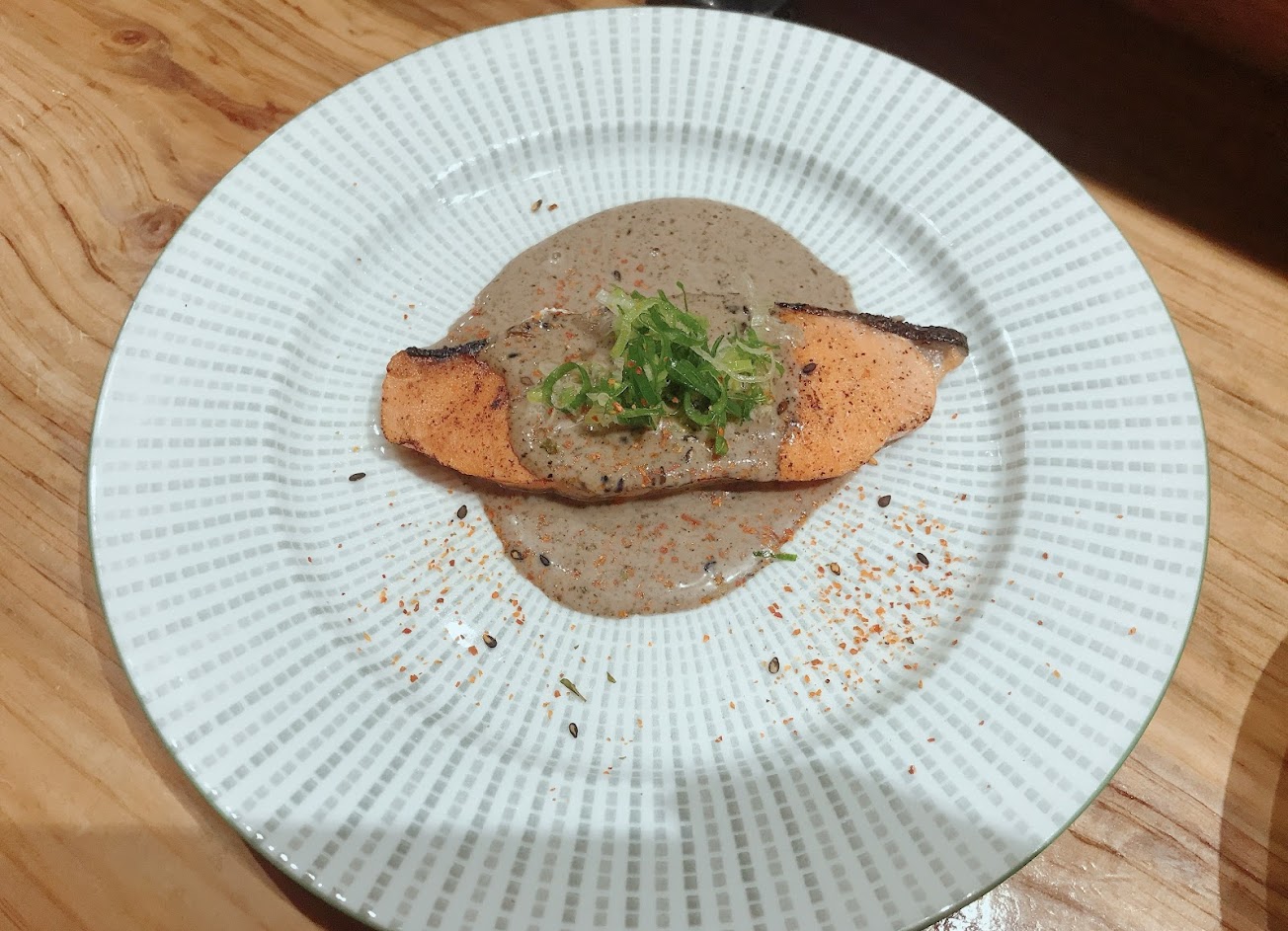 炙燒鮭魚片和鮭魚卵配上山葵佐醬油,鮮嫩極了,